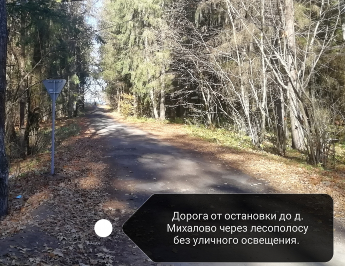 Дети, в зависимости от места нахождения их места жительства, вынуждены преодолевать по деревне до остановки школьного автобуса (ост. "Михалово" и ост. "Междуречье") расстояние до 2 км пешком. При этом, вне зависимости от места нахождения их дома в деревне, по пути на указанные остановки дети вынуждены проходить в абсолютной темноте участки улиц, необорудованные уличным освещением и проходящие через лесополосы длиной от 200 метров и более. С учётом того, что во время учебного года короткий световой день, мы беспокоимся за безопасность детей по пути на школьный автобус и домой.