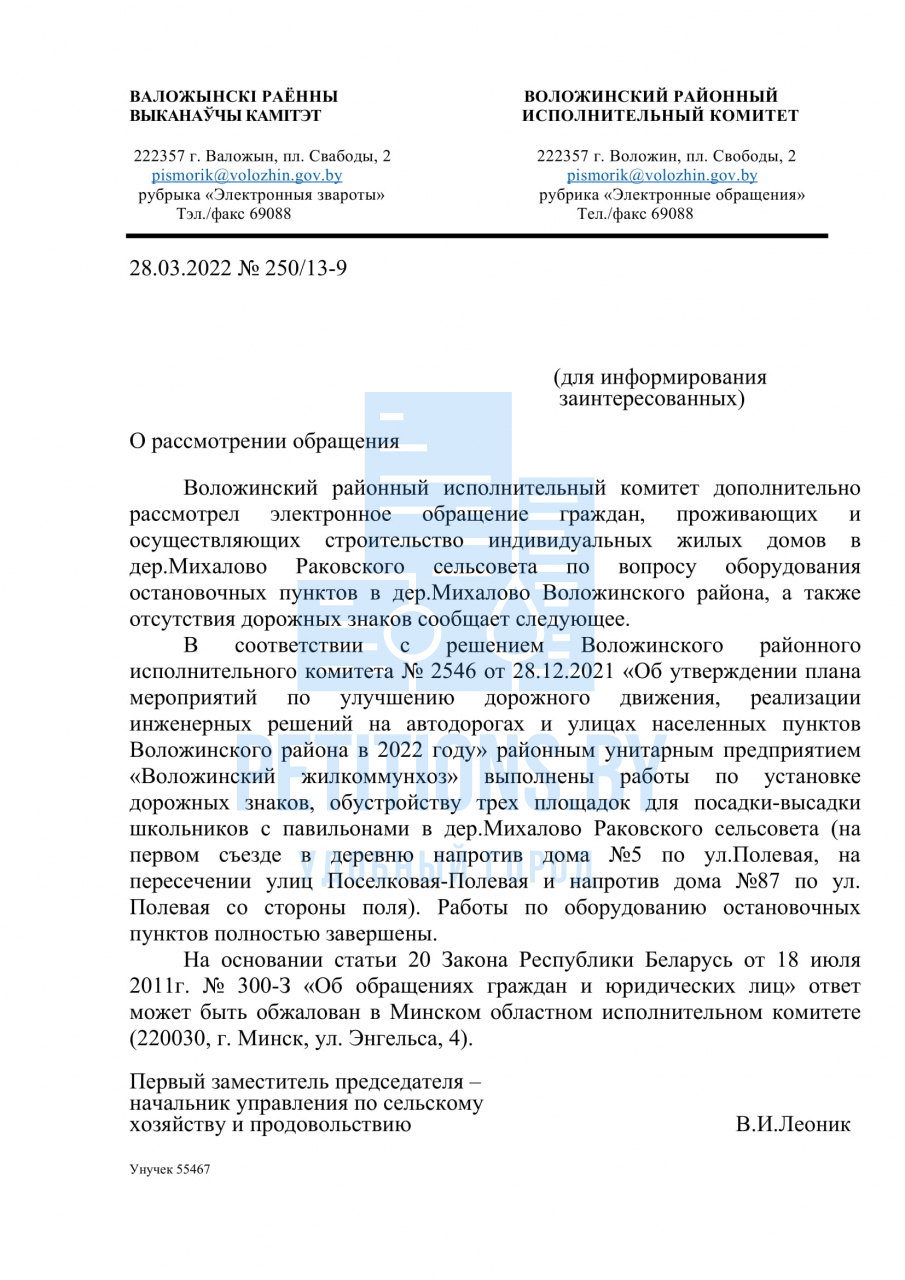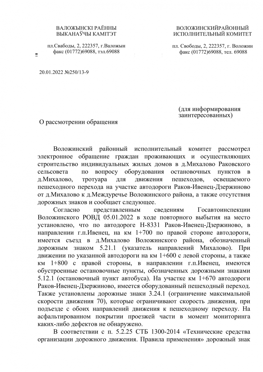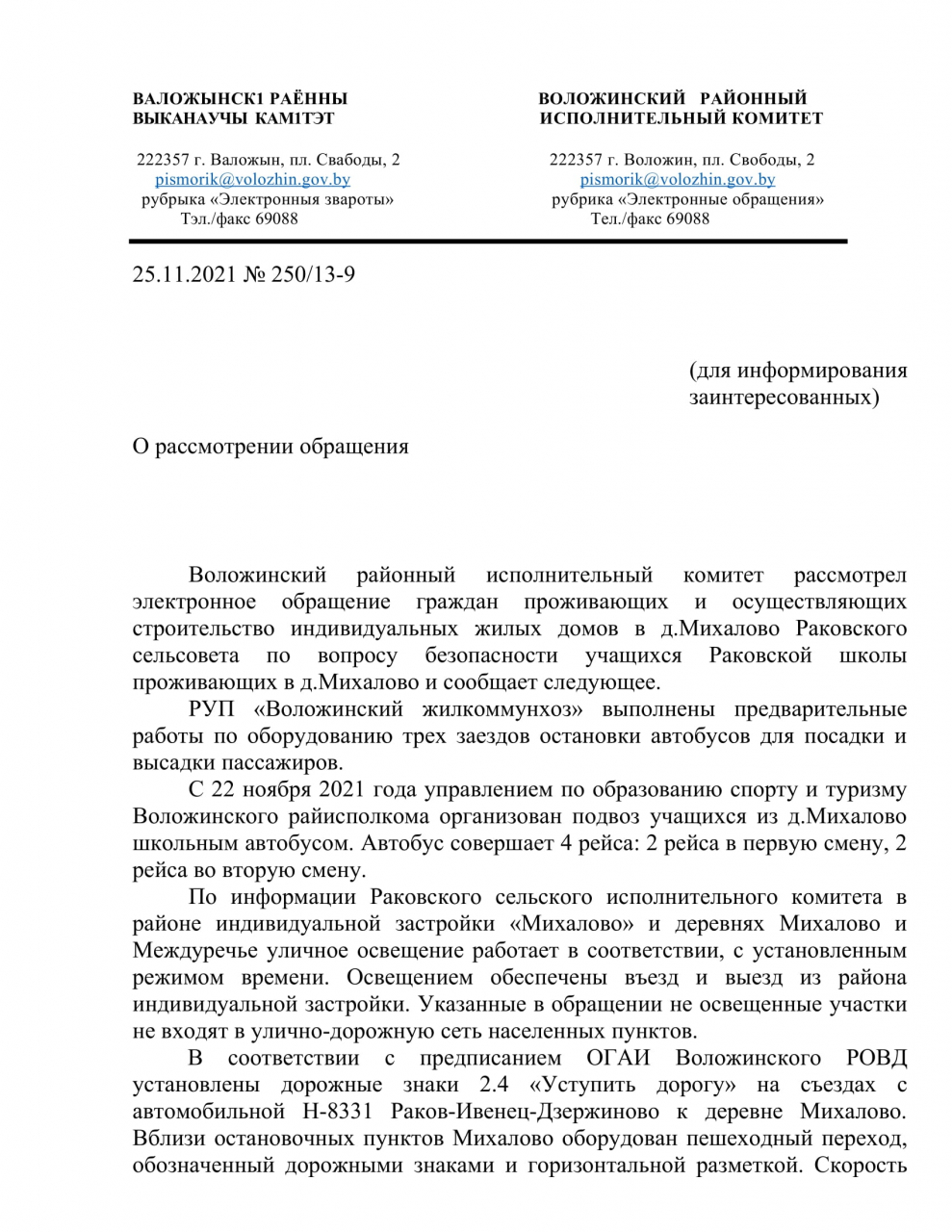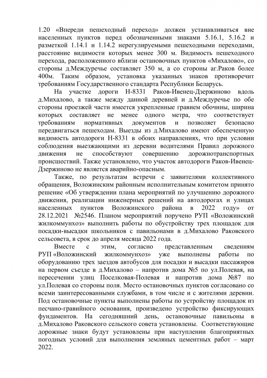 По результатам встречи с заявителями коллективного обращения, Воложинским райисполкомом принято решение «Об утверждении плана мероприятий по улучшению дорожного движения, реализации инженерных решений на автодорогах и улицах населённых пунктов Воложинского района в 2022 году» от 28.12.2021 №2546. Планом мероприятий поручено РУП «Воложинский жилкоммунхоз» выполнить работы по обустройству трёх площадок для посадки-высадки школьников с павильонами в д.Михалово Раковского сельсовета, в срок до апреля месяца 2022 г.