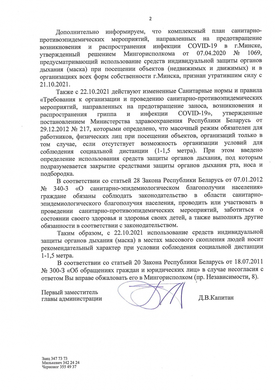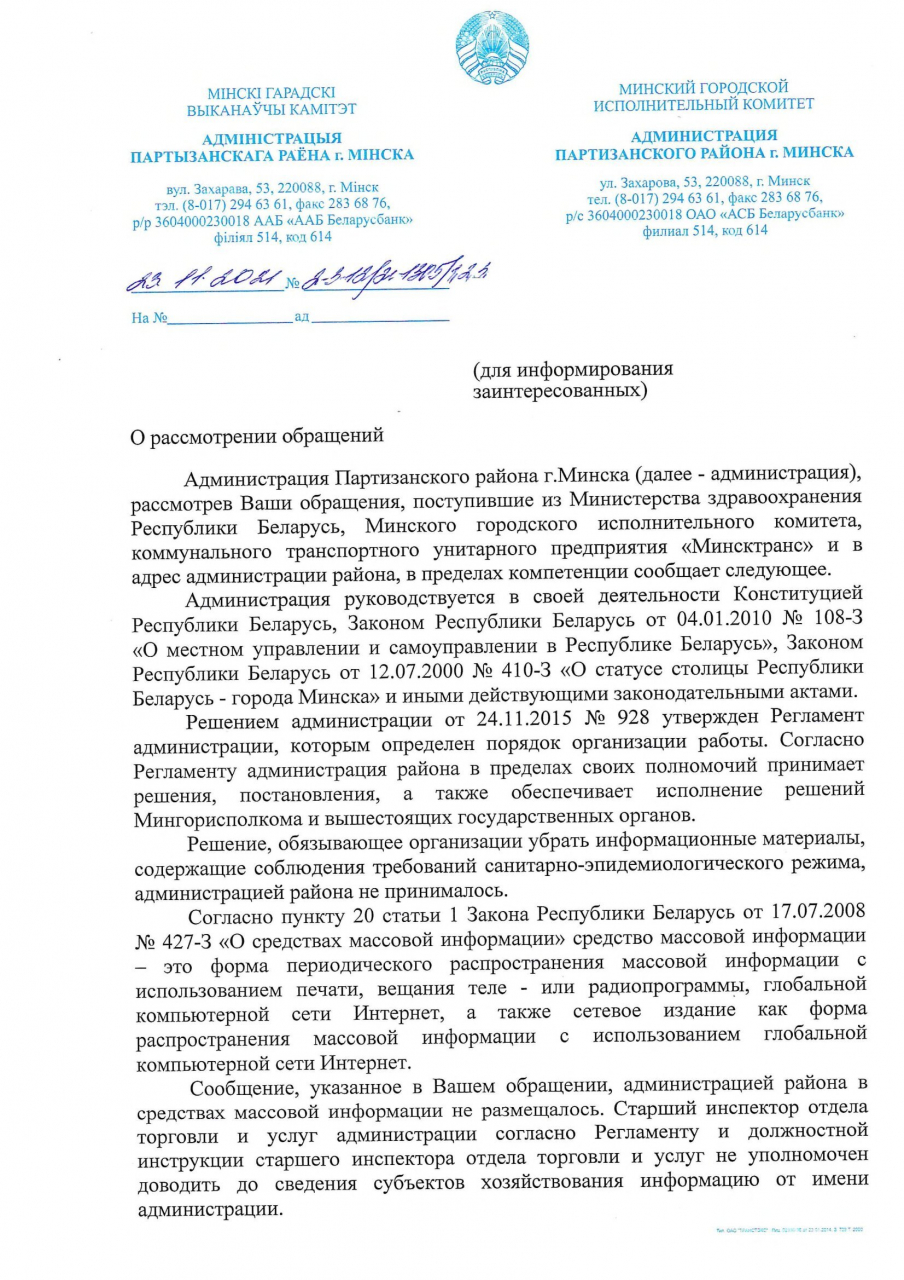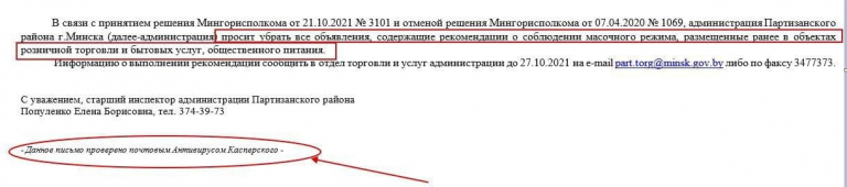 Также было опубликовано сообщение, рассылаемое Администрацией Партизанского района города Минска другим организациям с требованием убрать объявления, содержащие рекомендации по соблюдению масочного режима – в объектах розничной торговли и бытовых услуг, общественного питания (прилагается).