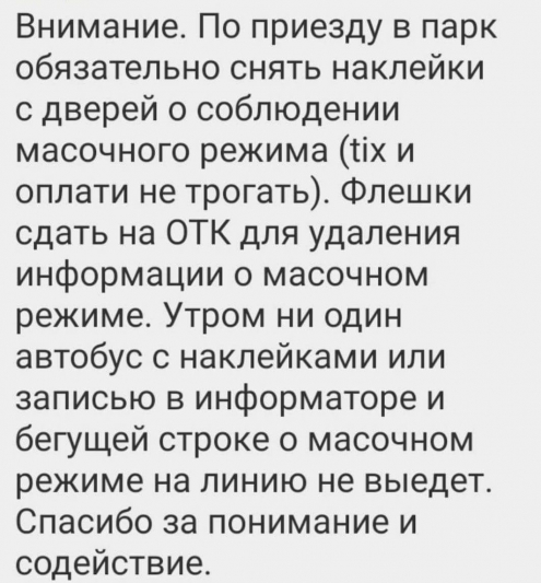 Так, в средствах массовой информации был опубликован скриншот сообщения, из которого следует, что водители по прибытии в парк должны снять наклейки о необходимости ношения масок при пользовании общественным транспортом. Также предписывается удалить с флеш-карт записи аудиосообщений, информирующих о необходимости соблюдении масочного режима (прилагается). Предположительно, указанное сообщение рассылалось водителям одного из автобусных пактов города Минска.