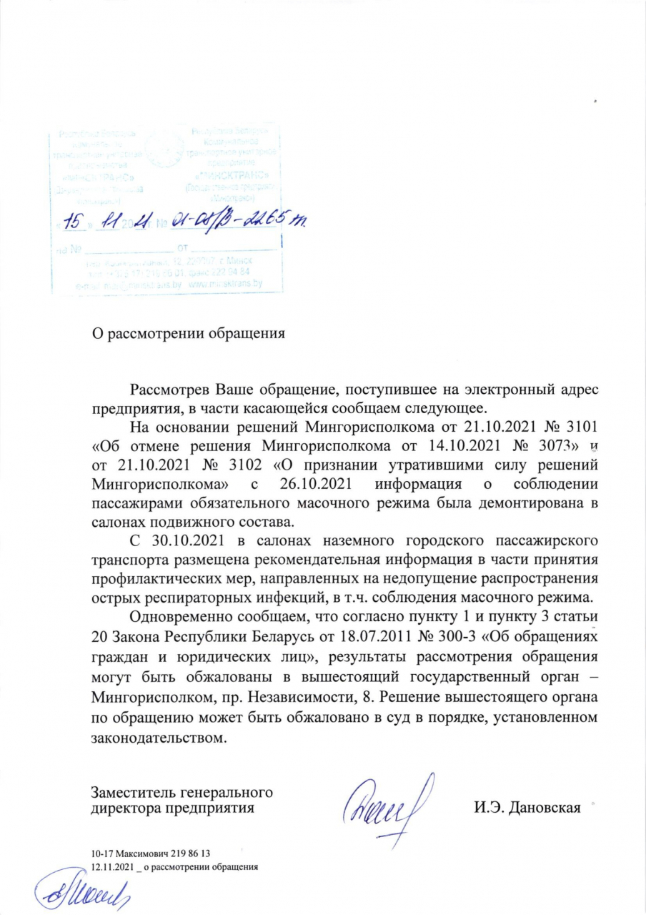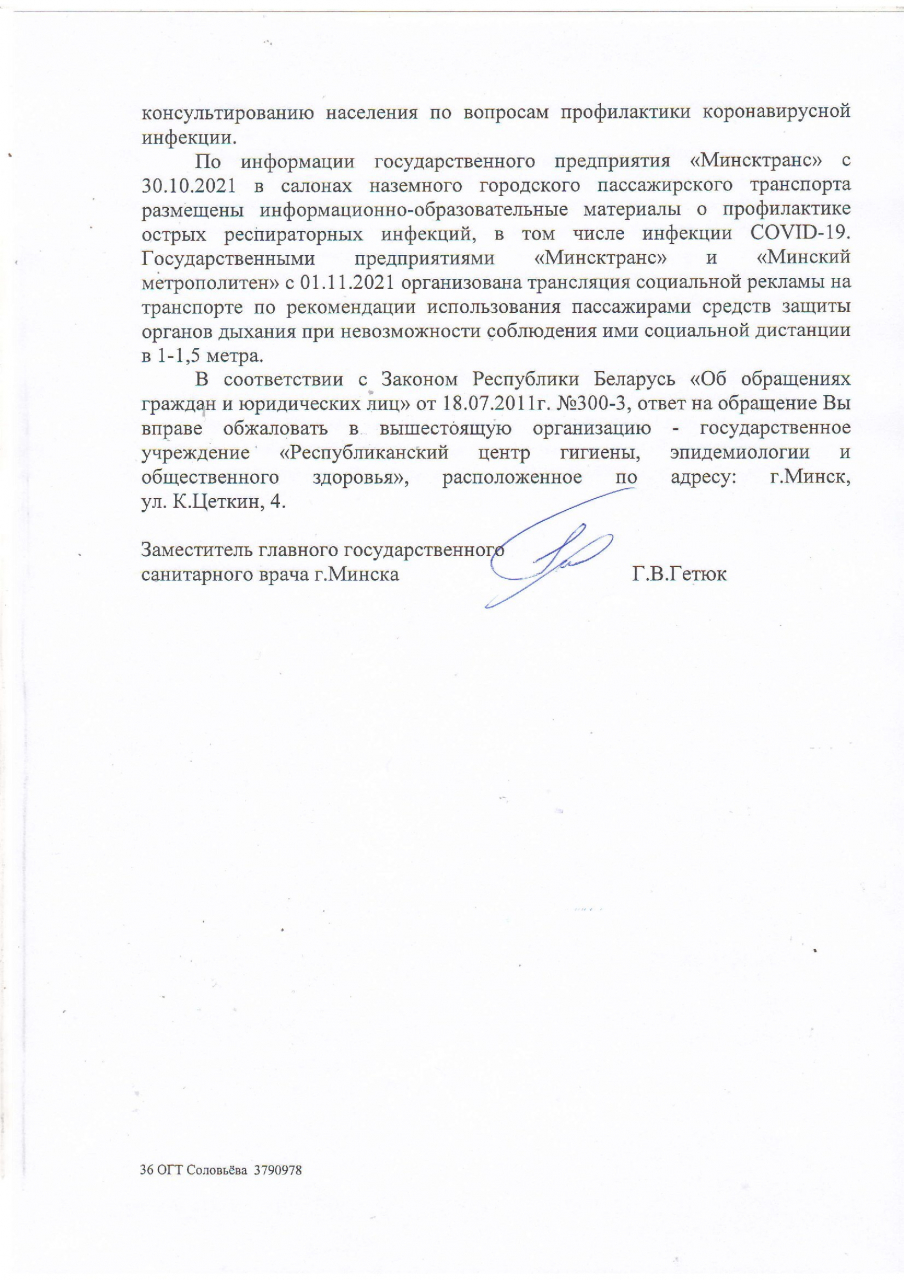 - пояснить, каким образом отсутствие информационных материалов о необходимости соблюдения масочного режима поможет в преодолении пандемии COVID-19 на территории Партизанского района города Минска, а также сделает более безлопастным пользование общественным транспортом города Минска?