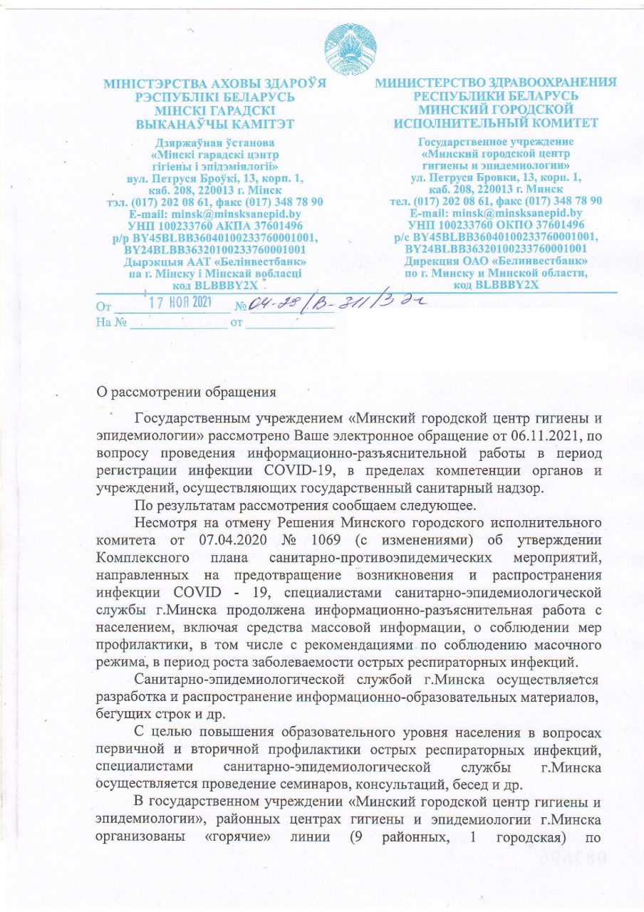 - пояснить, является ли целесообразным информирование население города Минска о необходимости соблюдения масочного режима?
