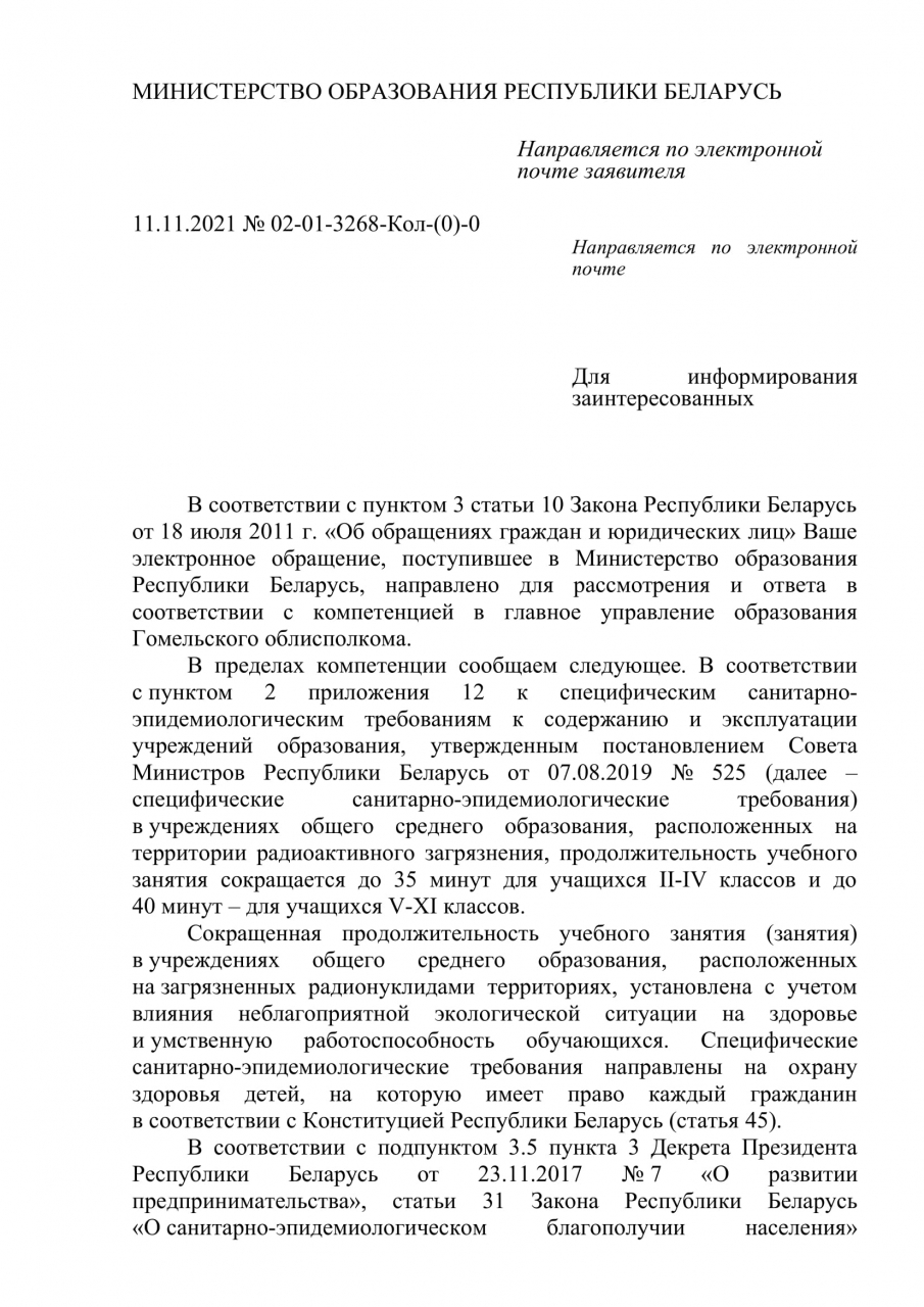Поэтому, просим Вас рассмотреть и решить вопрос о пересмотре и внесении изменений в Постановление Совета Министров Республики Беларусь №525 от 07.08.2019 в части приложения № 12 «…2.Продолжительность учебного занятия (занятия) сокращается: до 35 минут для детей в возрасте от 7 до 10 лет (II–IV класс) и до 40 минут – для детей от 10 лет (V–XI класс) в учреждениях для детей, расположенных на территориях радиоактивного загрязнения, в санаторно-курортных организациях и санаторных школах-интернатах;…» и на ближайшем заседании скорректировать их таким образом, чтобы права всех заинтересованных в образовательном процессе Гомельской области и всей остальной страны не были ущемлены либо просто отменить этот пункт приложения №12 в указанном постановлении.