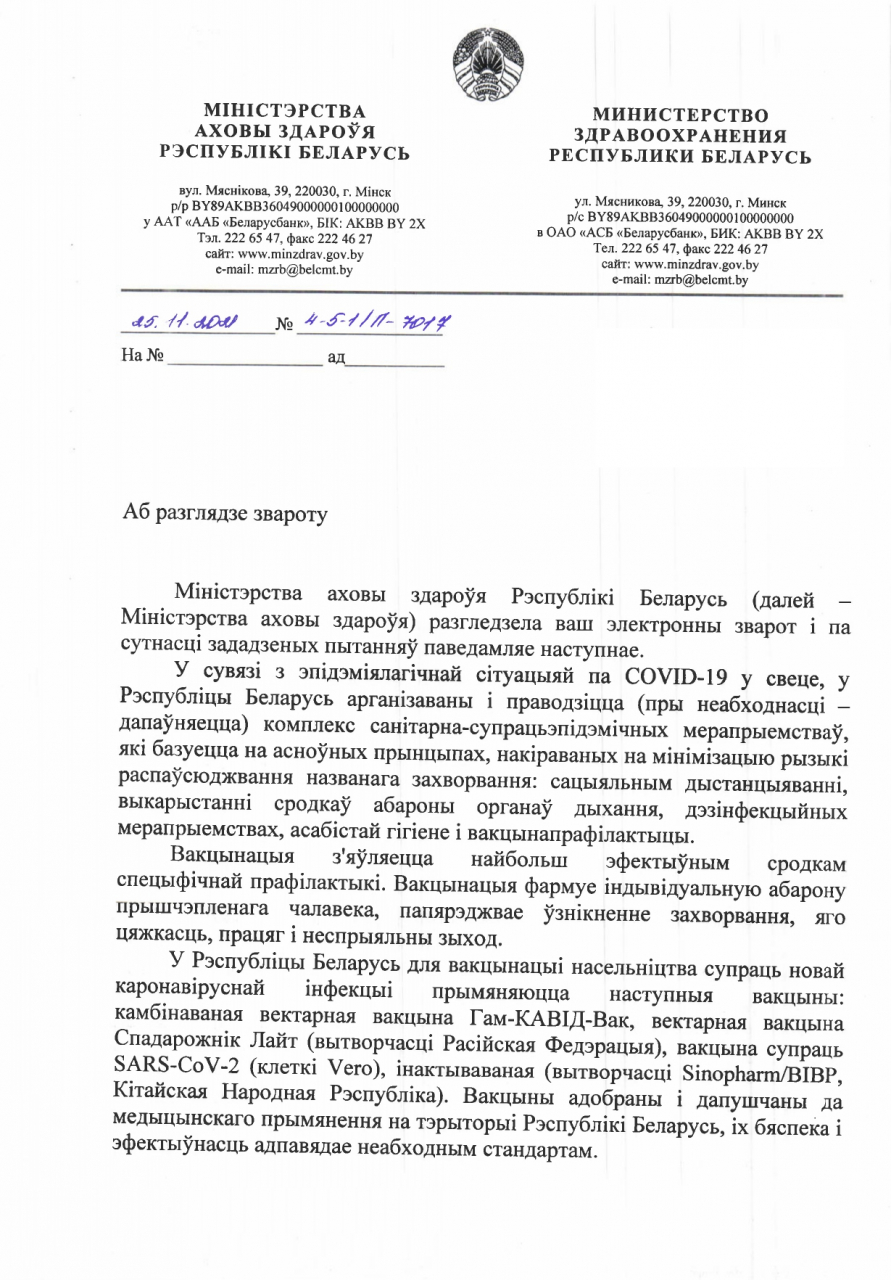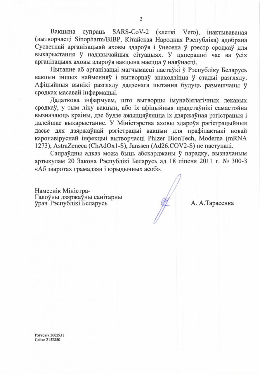 Пытанне аб арганізацыі магчымасці пастаўкі ў Рэспубліку Беларусь вакцын іншых найменаванняў і вытворцаў (акрамя Гам-КАВІД-Вак, Спадарожнік Лайт вытворчасці Расійскай Федерацыі і вытворчасці Sinopharm/BIPB Кітайскай Народнай Рэспублікі) знаходзіцца ў стадыі разгляду. Афіцыйныя вынікі разгляду дадзенага пытання будуць размешчаны ў СМІ.