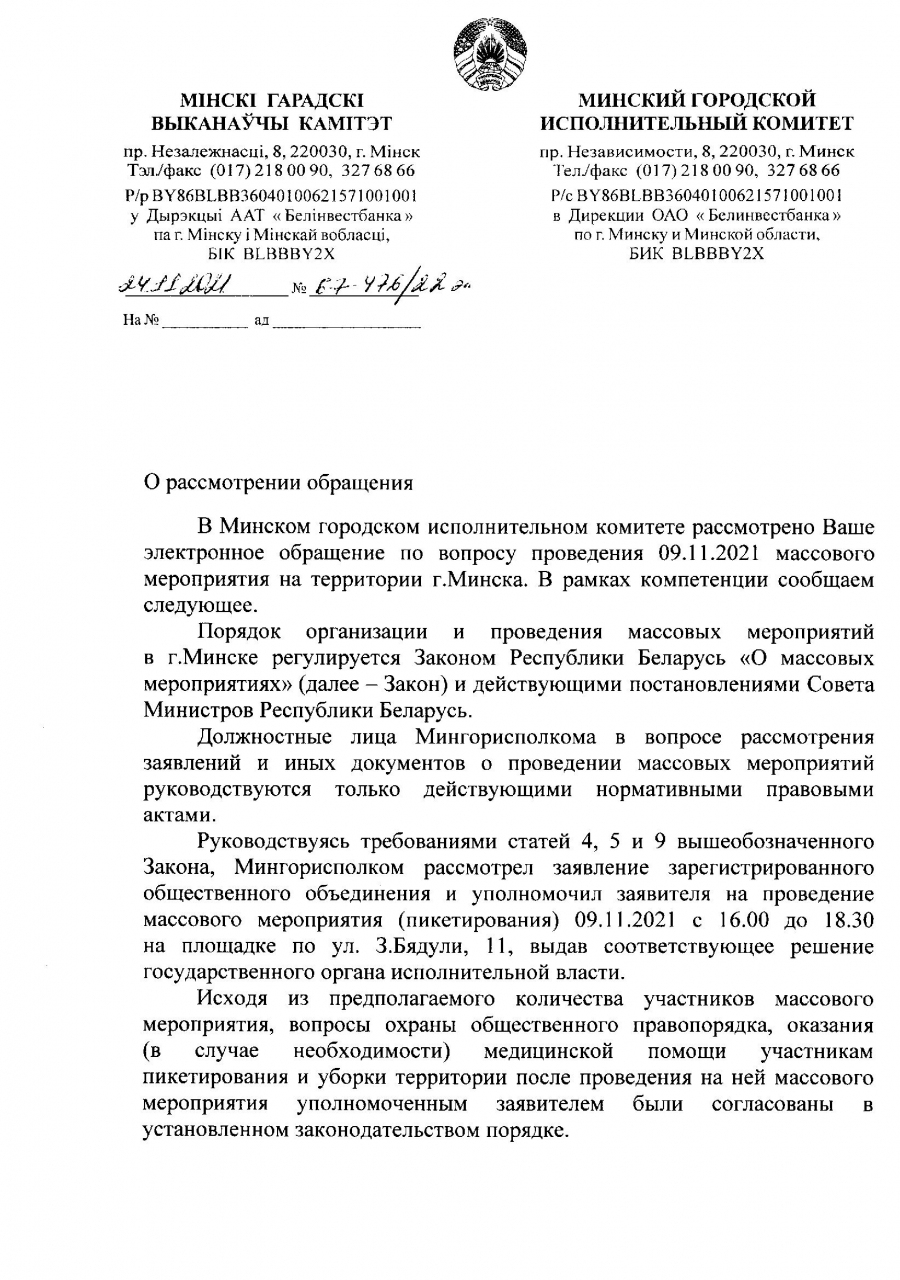 Руководствуясь требованиями ст. 4, 5 и 9 Закона «О массовых мероприятиях», Мингорисполком рассмотрел заявление зарегистрированного общественного объединения и уполномочил заявителя на проведение массового мероприятия (пикетирования) 09.11.2021 с 16.00 до 18.30 на площадке по ул. 3.Бядули, 11, выдав соответствующее решение государственного органа исполнительной власти.
