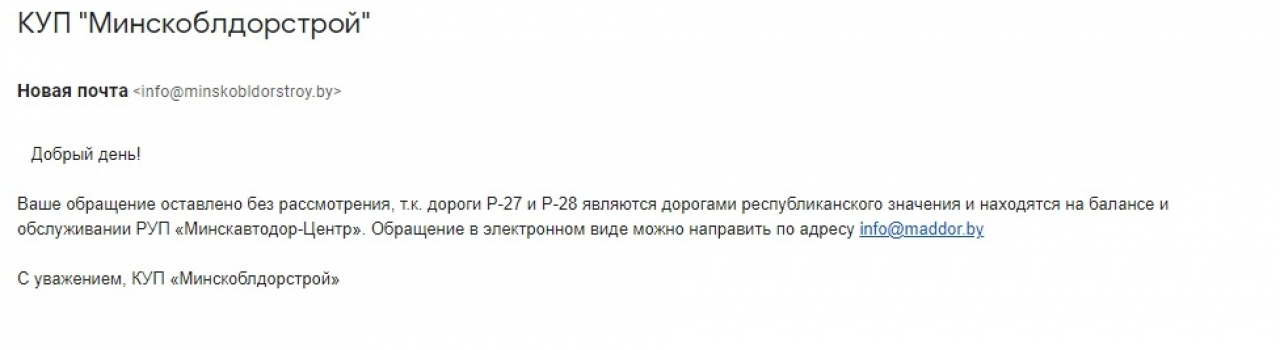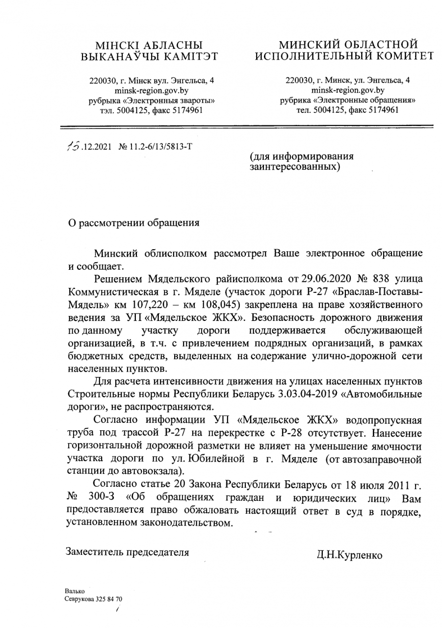 Отмечаем что ответ РИК г.Мядель № 03/1-03/60кл на коллективное обращение по вопросу закрепления участка дороги Р_27 от перекрёстка с Р-28 до остановки общественного транспорта «ЦРБ» на баланс ДЭУ не выполнено, как известно общественности данный участок стал закреплён за ЖКХ г.Мядель во втором квартале 2019 года.