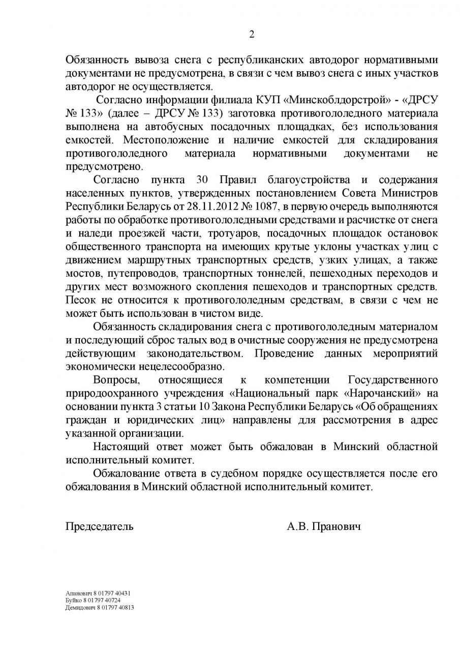 28.11.2012 № 1087 (далее - Правила), ежегодно в срок до 1 октября местные исполнительные и распорядительные органы согласовывают определенные специализированными организациями по содержанию улично-дорожной сети площадки складирования снега в соответствии с законодательством об охране окружающей среды и рациональном использовании природных ресурсов (при условии размещения их в местах с преимущественно глубоким залеганием грунтовых вод и недопущения попадания талых вод в водные объекты, на озелененные территории, особо охраняемые природные территории, природные территории, подлежащие специальной охране, а также выполнения мероприятий, предотвращающих загрязнение почв, порчу иного имущества, сброс в эти места отходов, скопление воды при таянии снега, в соответствии с требованиями технических нормативных правовых актов).
