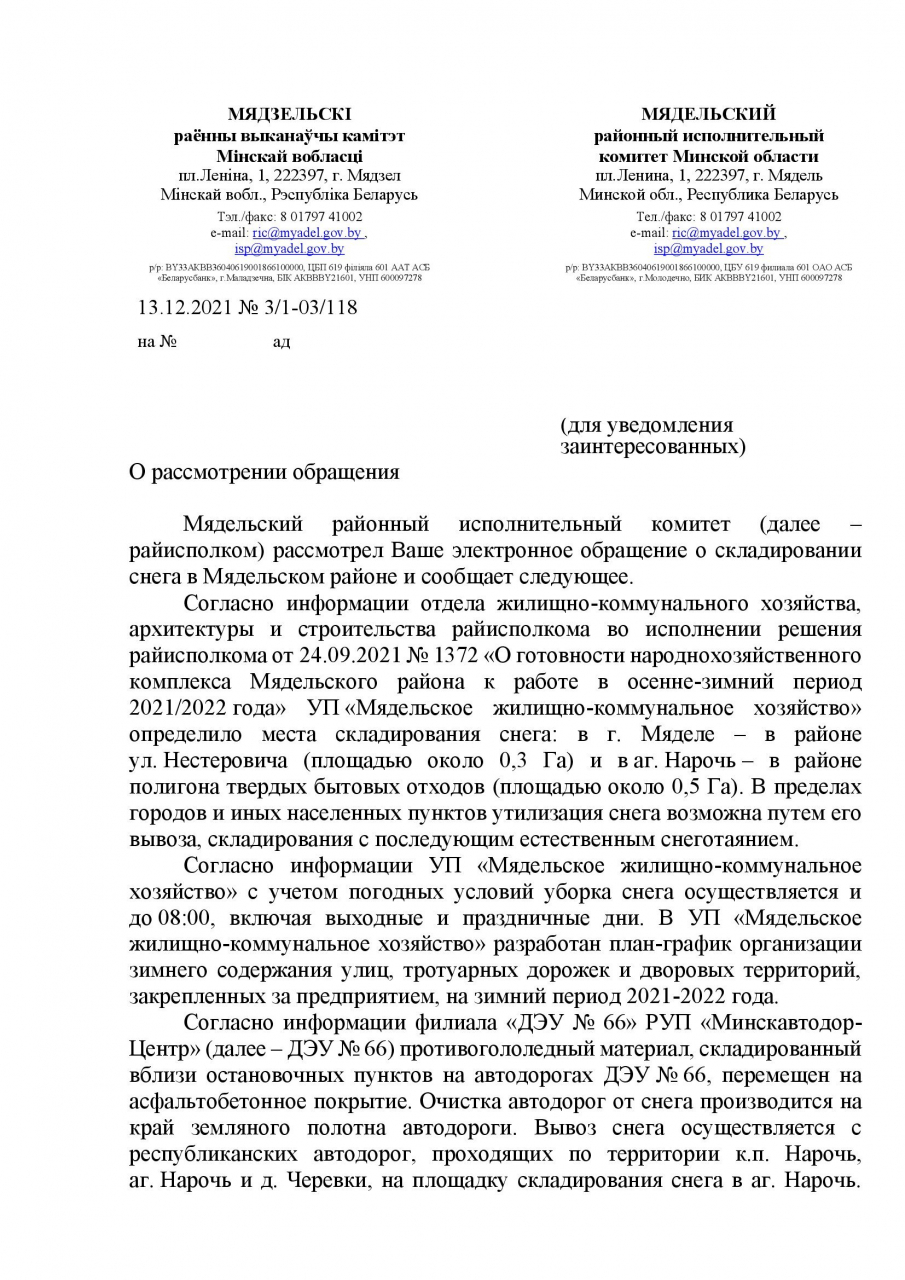 - УП «Мядельское ЖКХ» определило места складирования снега: в г. Мяделе – в районе ул. Нестеровича (площадью около 0,3 Га) и в аг. Нарочь – в районе полигона твердых бытовых отходов (площадью около 0,5 Га).