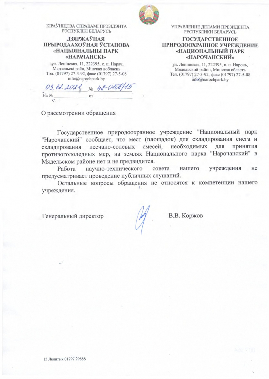 ГПУ "Национальный парк "Нарочанский" – на основании Временного стандарта NEPCon для оценки лесоуправления в Республике Беларусь (версия 19 декабря 2014), а также п. 3 Положения о Национальном парке «Нарочанский» (утв. указом Президента Республики Беларусь от 09.02.2012 № 59) - просим рассмотреть вопрос проведения публичных заседаний научно-технического совета национального парка по вопросам складирования ПСС во внутренней охранной зоне и самом национальном парке.