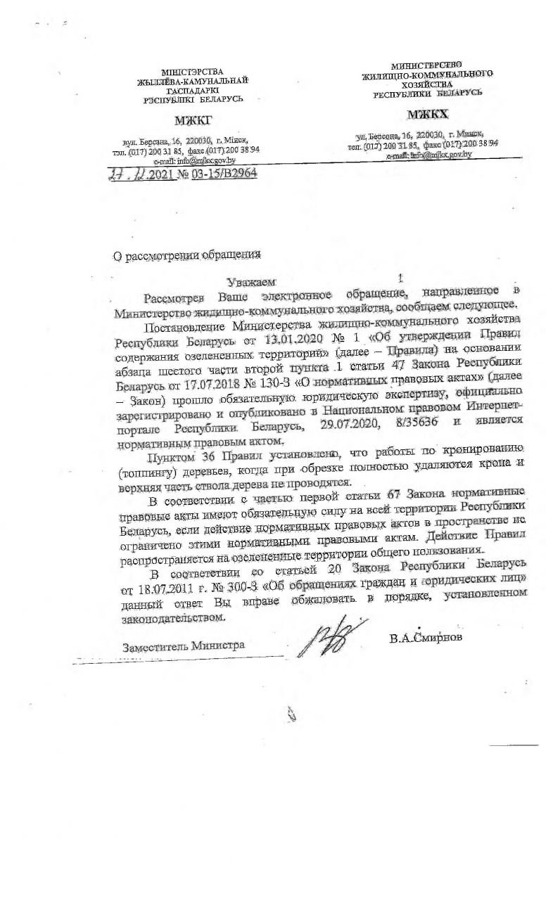 Часть восьмая пункта 36 Правил содержания озелененных территорий, утвержденных постановлением Министерства жилищно-коммунального хозяйства Республики Беларусь от 13.01.2020 № 1 (далее – Правила) установила, что не проводятся работы по кронированию (топпингу) деревьев, когда при обрезке полностью удаляются крона и верхняя часть ствола дерева.