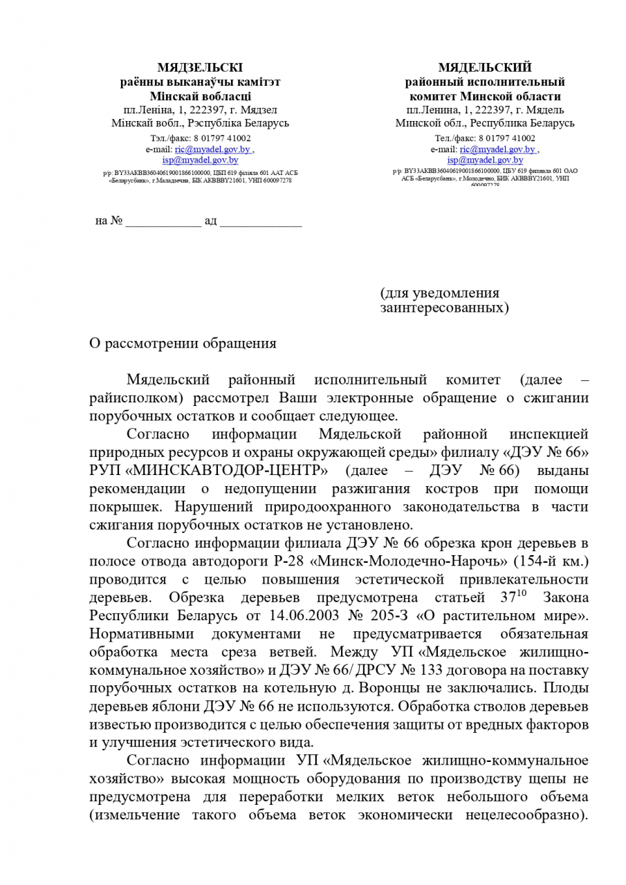 4. Наличие договоров (ДЭУ, ДРСУ) с ЖКХ г.Мядель на доставку порубочных остатков на котельные района, как это было обещано на общественных обсуждениях по строительству котельной на щепе вблизи д.Воронцы.