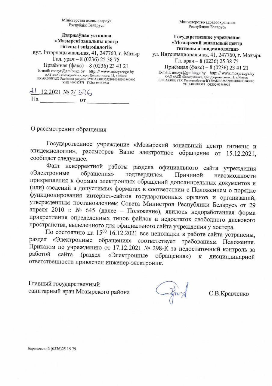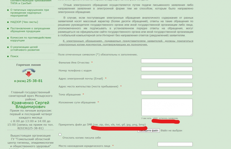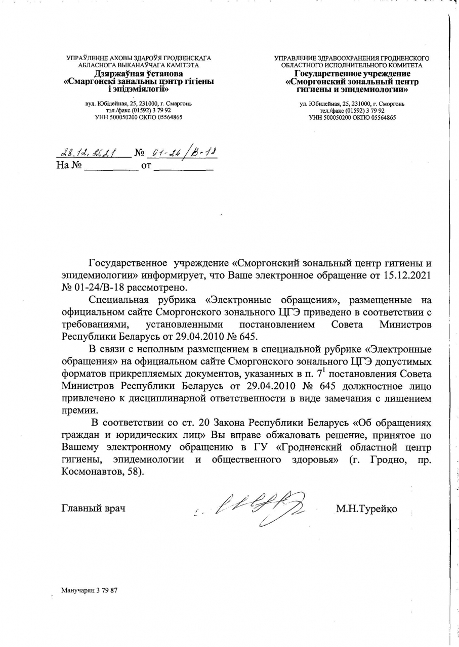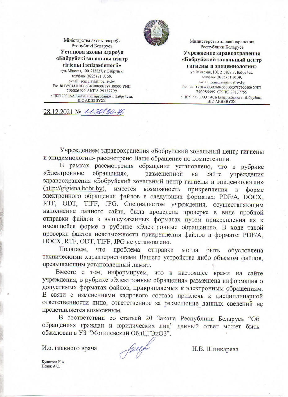 В специальной рубрика «Электронные обращения», размещенной на сайте ГУ «Мозырский зональный центр гигиены и эпидемиологии» (https://www.mozyrzcge.by/) не допускается возможность прикрепления к подаваемым электронным обращениям документов и файлов в следующих форматах, предусмотренных Положением № 645: PDF/A, DOCX, RTF, ODT, TIFF, и JPG (скриншот прилагается). Аналогичная проблема (несоответствие допустимых форматов для прикрепления к форме электронного обращения документов и файлов, а также отсутствие указанной информации) есть в специальной рубрике «Электронные обращения», размещенной на сайте ГУ «Сморгонский зональный центр гигиены и эпидемиологии» (http://smorgoncge.by/) и УЗ «Бобруйский зональный центр гигиены и эпидемиологии» (http://gigiena.bobr.by/electronnye-obrascheniya.html).