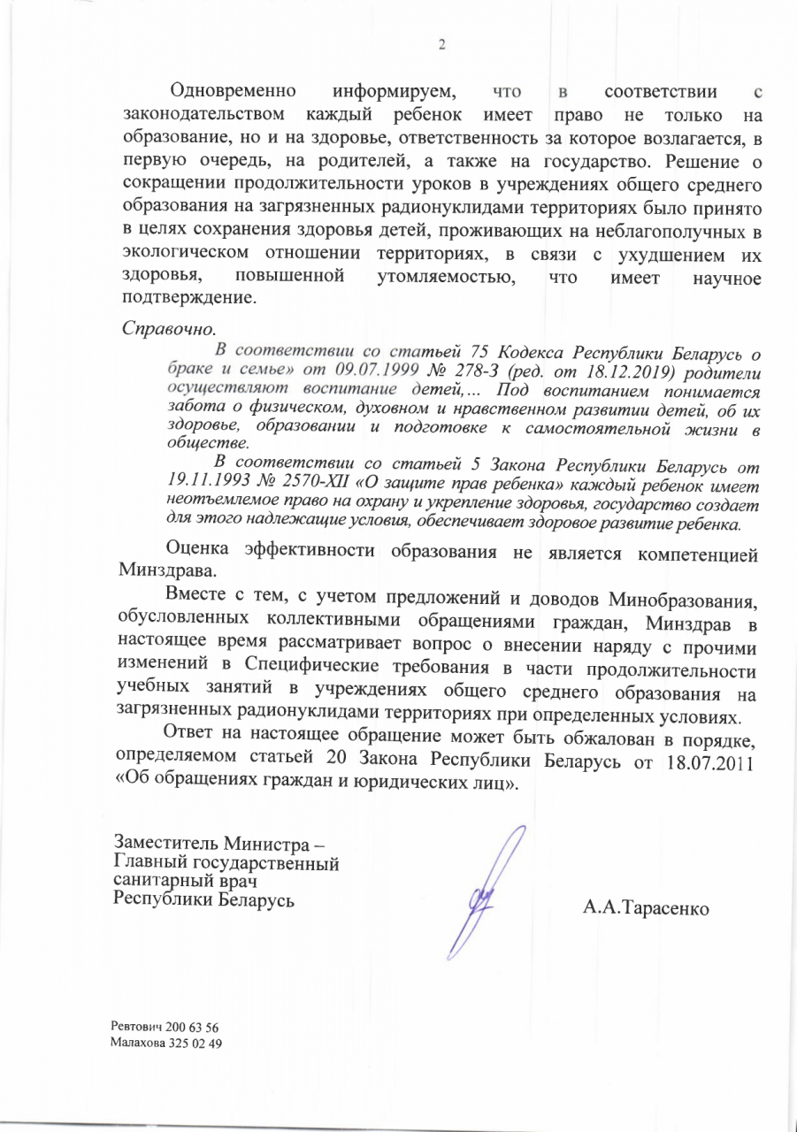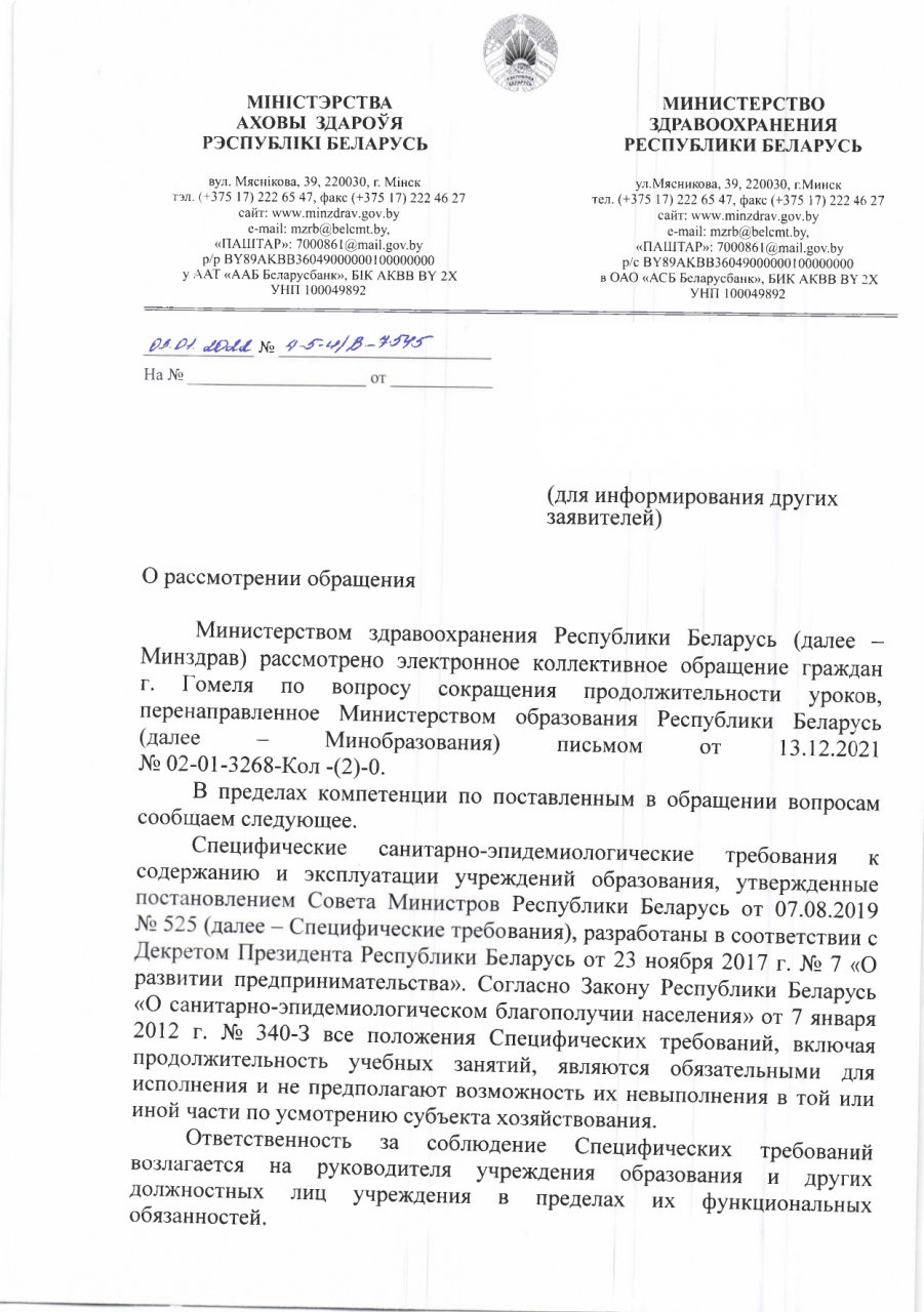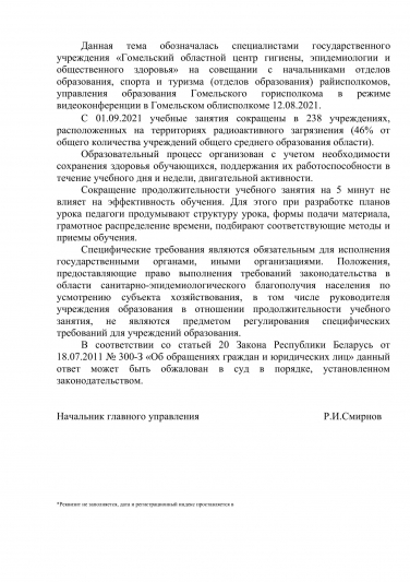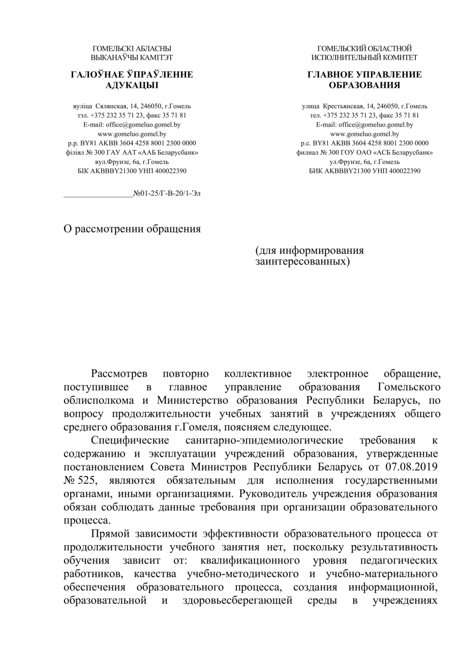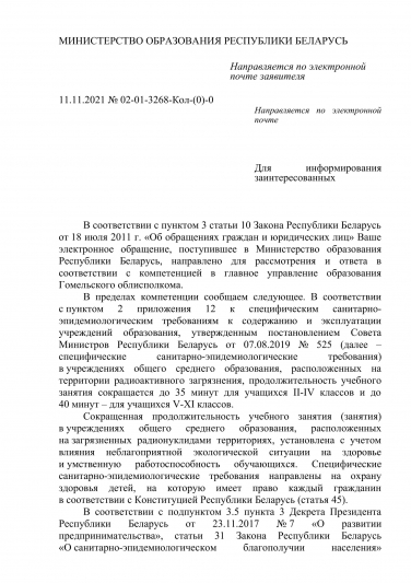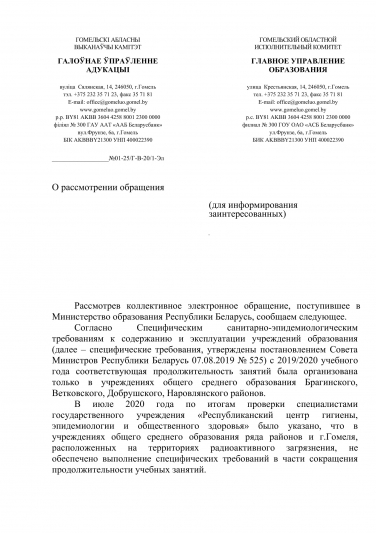 В адрес Министерства образования Республики Беларусь и Главного управления образования Гомельского облисполкома было направлено коллективное обращение (прилагается) по поводу продолжительности школьных занятий в учреждениях среднего общего образования города Гомеля, установленной с 1 сентября 2021 года.