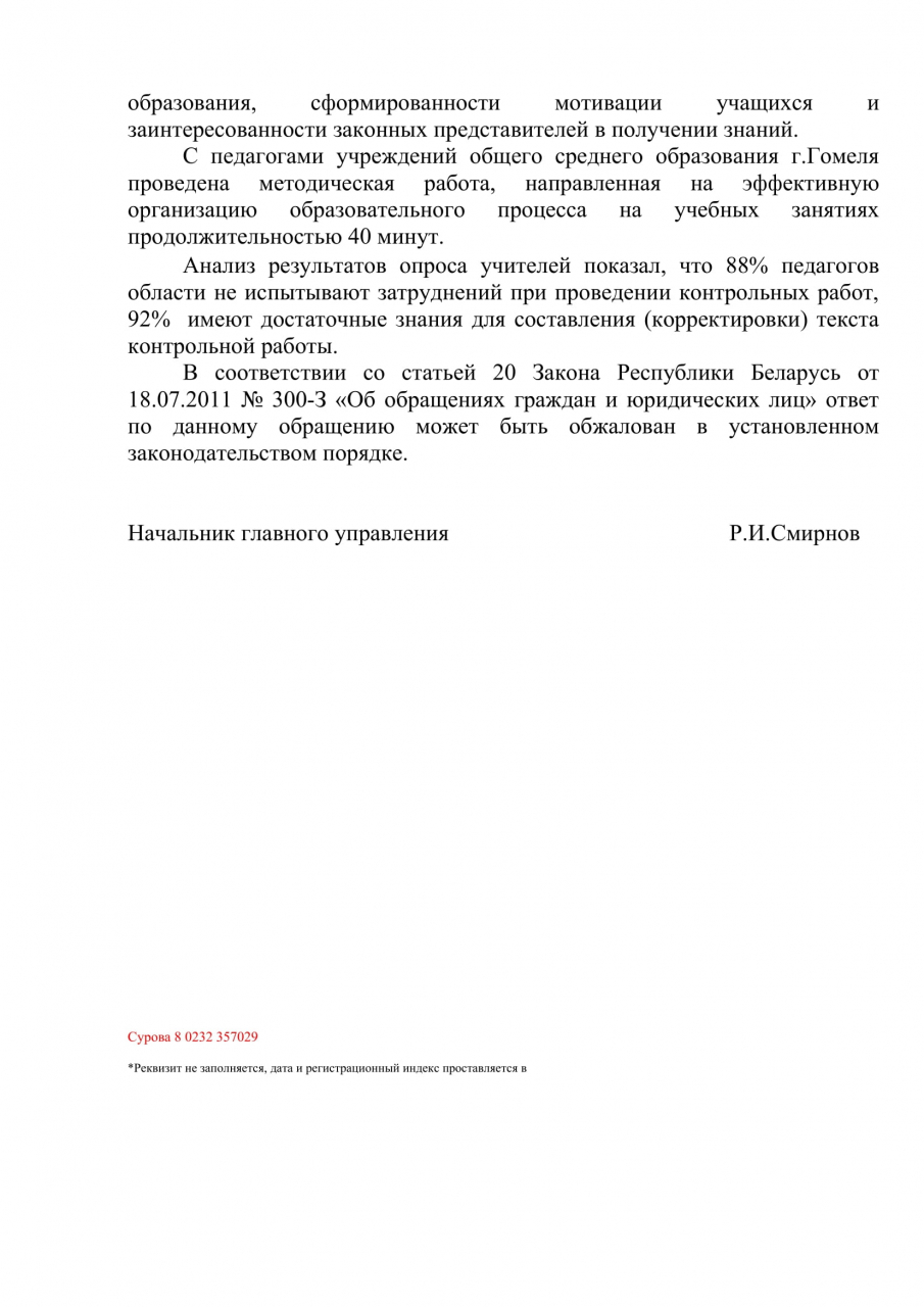 Рассчитываем на Ваш ответ и просим Вас содействовать принятию решения о возвращении уроков в обычном формате по 45 минут в учреждения общего среднего образования города Гомеля, как это установлено в остальных городах и регионах учреждений образования Республики Беларусь в целом по стране и не только в нашей стране.
