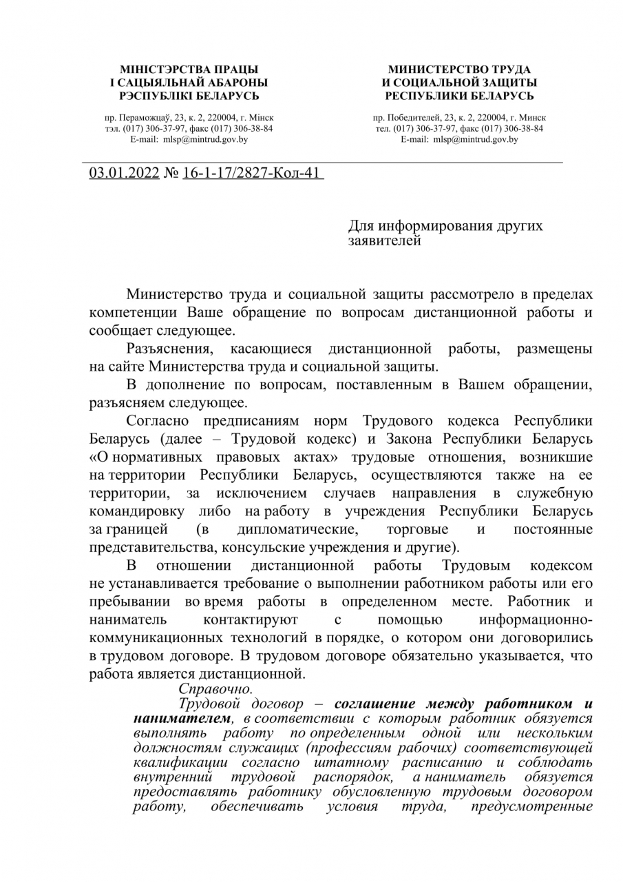 На сайте же Минтруда размещено разъяснение, посвященное дистанционной работе. Ссылка: https://www.mintrud.gov.by/system/extensions/spaw/uploads/files/Distantsionnaja-rabota-na-sajt.pdf