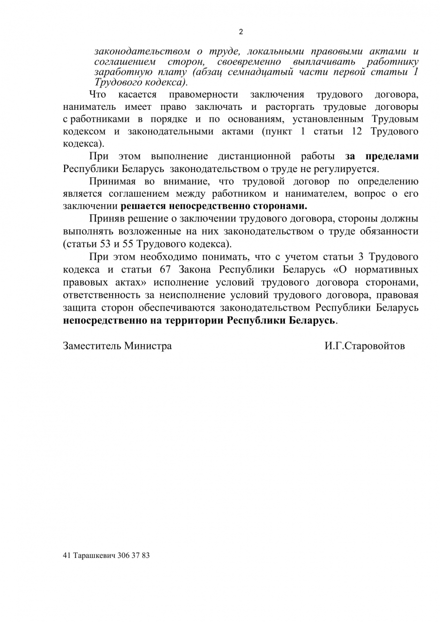 Таким образом, в комментарии Минтруда четко указано, что с одной стороны, «в отношении дистанционной работы ТК не устанавливается требование о выполнении работником работы или его пребывании во время работы в определенном месте», а с дугой – «трудовые отношения, возникшие на территории Республики Беларусь, осуществляются также на её территории».
