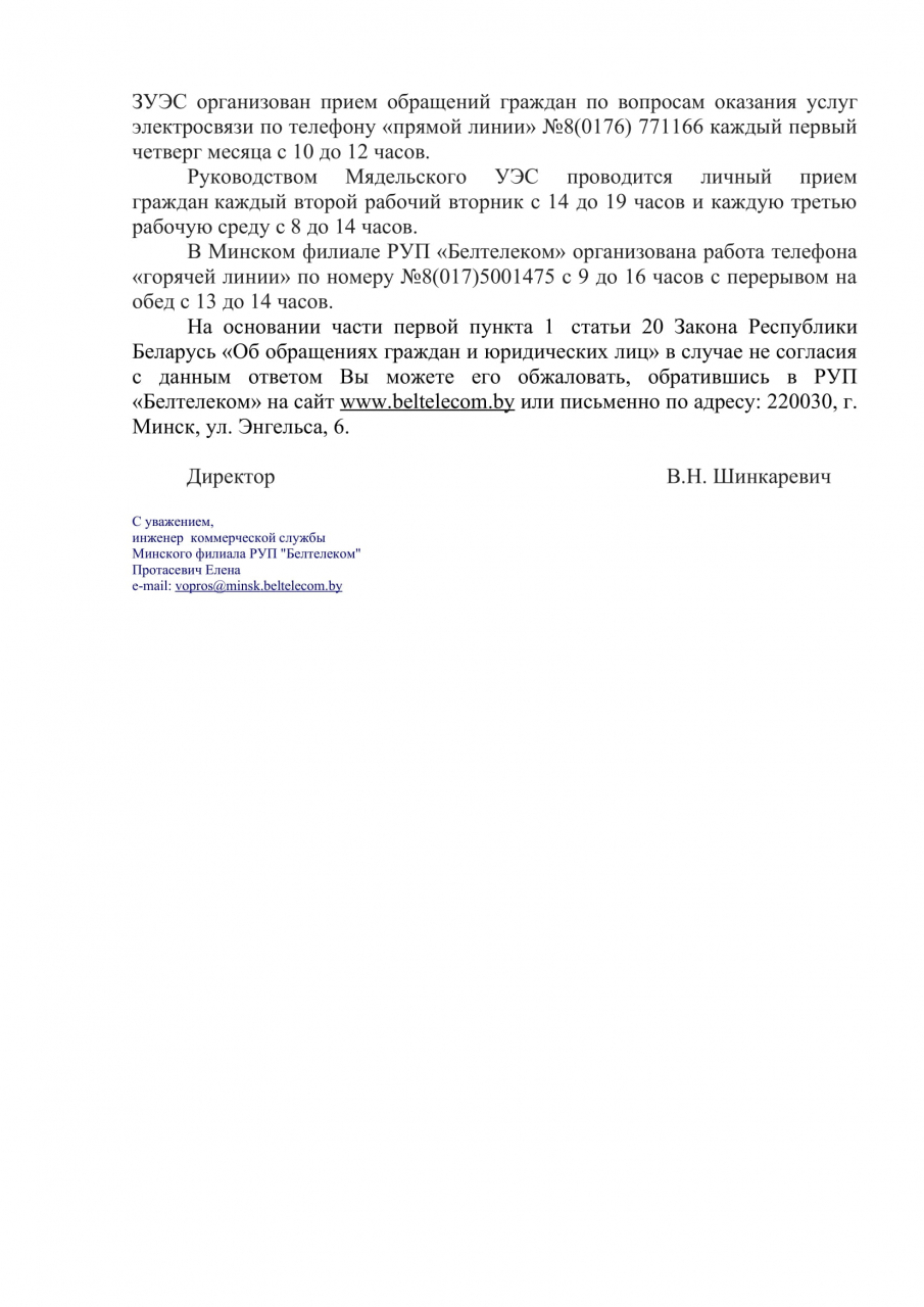 Мядельский участок электросвязи Молодечненского зонального узла электросвязи Минского филиала РУП «Белтелеком» по адресу г. Мядель, ул.Крупской, д.2. Малько Анатолий Алексеевич, начальник участка электросвязи, тел. 8 01797, [email protected]
