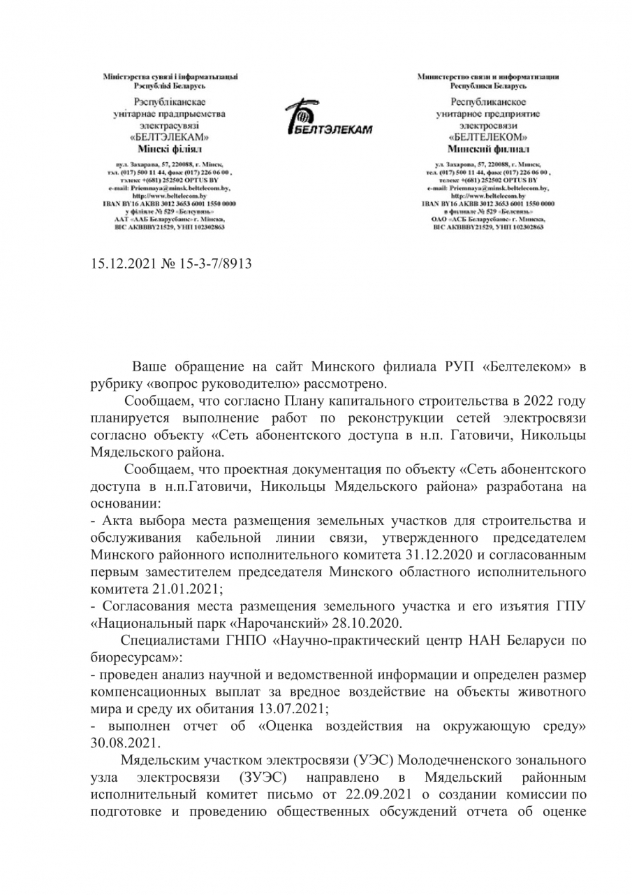 Вопросы и предложения к проекту по общественному обсуждению «Сеть абонентского доступа в н.п. Гатовичи и Никольцы Мядельского района»: