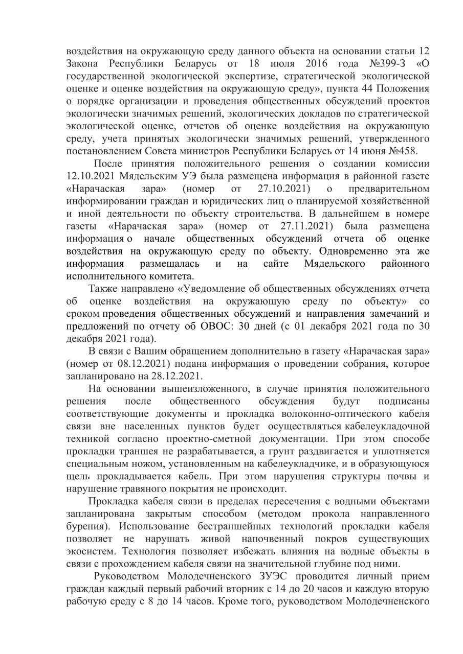 "В соответствии с абзацем четвёртым части первой пункта 44 и пунктом 47 Положения о порядке организации и проведения общественных обсуждений проектов экологически значимых решений, экологических докладов по стратегической экологической оценке, отчетов об оценке воздействия на окружающую среду, учета принятых экологически значимых решений (утверждено постановлением Совета Министров Республики Беларусь № 458 от 14 июня 2016 г. (в редакции постановления Совета Министров Республики Беларусь № 24 от 13 января 2017 г.) «Об утверждении Положения о порядке организации и проведения общественных обсуждений проектов экологически значимых решений, экологических докладов по стратегической экологической оценке, отчетов об оценке воздействия на окружающую среду, учета принятых экологически значимых решений и внесении изменений и дополнения в некоторые постановления Совета Министров Республики Беларусь») в рамках строительного проекта по объекту «Сеть абонентского доступа в н.п. Гатовичи и Никольцы Мядельского района» настоящим заявляем о необходимости проведения собрания по обсуждению отчёта об ОВОС планируемой хозяйственной деятельности и назначению даты собрания с уведомлением общественности, на 17 00.