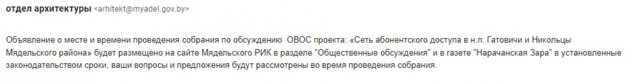 Объявление о месте и времени проведения собрания по обсуждению ОВОС проекта: «Сеть абонентского доступа в н.п. Гатовичи и Никольцы Мядельского района» будет размещено на сайте Мядельского РИК в разделе "Общественные обсуждения" и в газете "Нарачанская Зара" в установленные законодательством сроки, вопросы и предложения заявителей будут рассмотрены во время проведения собрания.