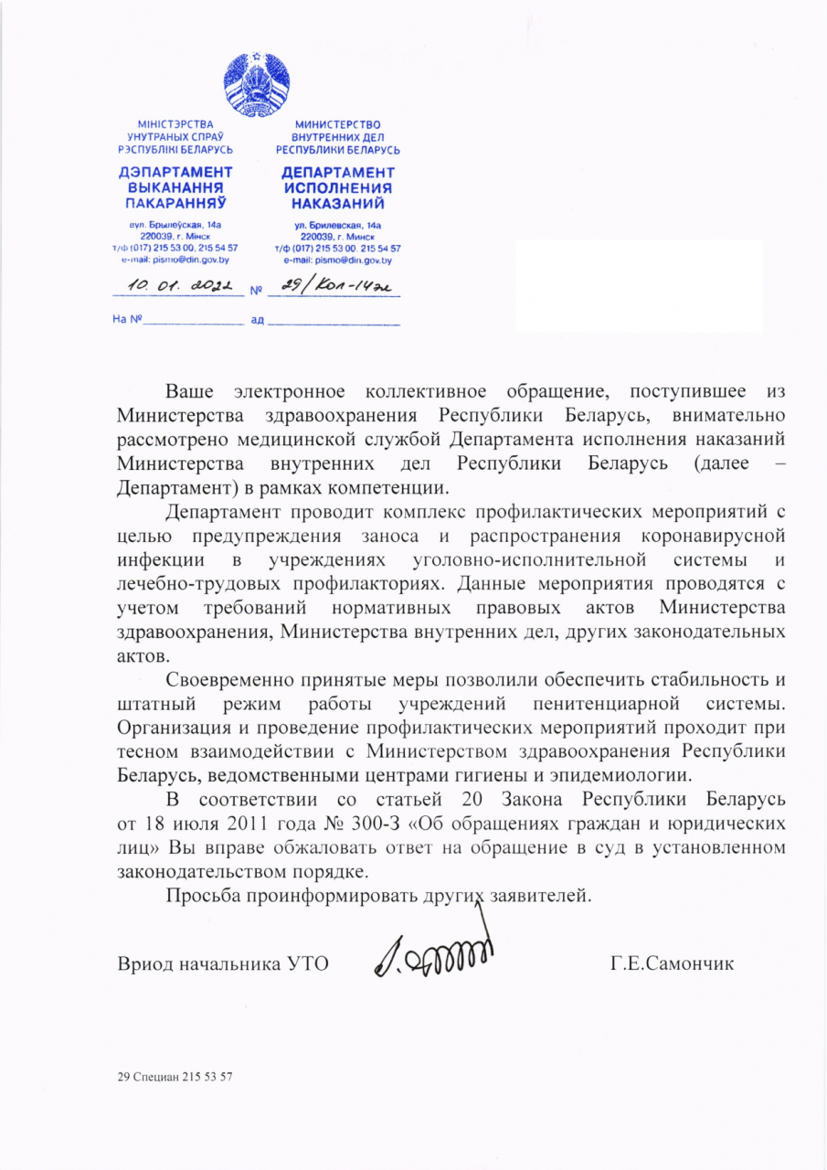 Департамент исполнения наказаний МВД проводит комплекс профилактических мероприятий с целью предупреждения заноса и распространения коронавирусной инфекции в учреждениях уголовно-исполнительной системы и лечебно-трудовых профилакториях. Организация и проведение профилактических мероприятий проходит при тесном взаимодействии с Минздравом и ведомственными центрами гигиены и эпидемиологии.