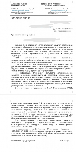 В адрес Воложинского райисполкома было направлено коллективное обращение по поводу заезда школьного автобуса в д.Михалово (Раковский сельсовет) и безопасности жителей данного населённого пункта. На обращение получен ответ от Воложинского райисполкома от 25.11.2021 №250/13—9 (прилагается). В ходе изучения данного документа мы не нашли ответов по существу на некоторые поставленные вопросы, также полученные ответы остались не ясными и не решающими существующие проблемы.