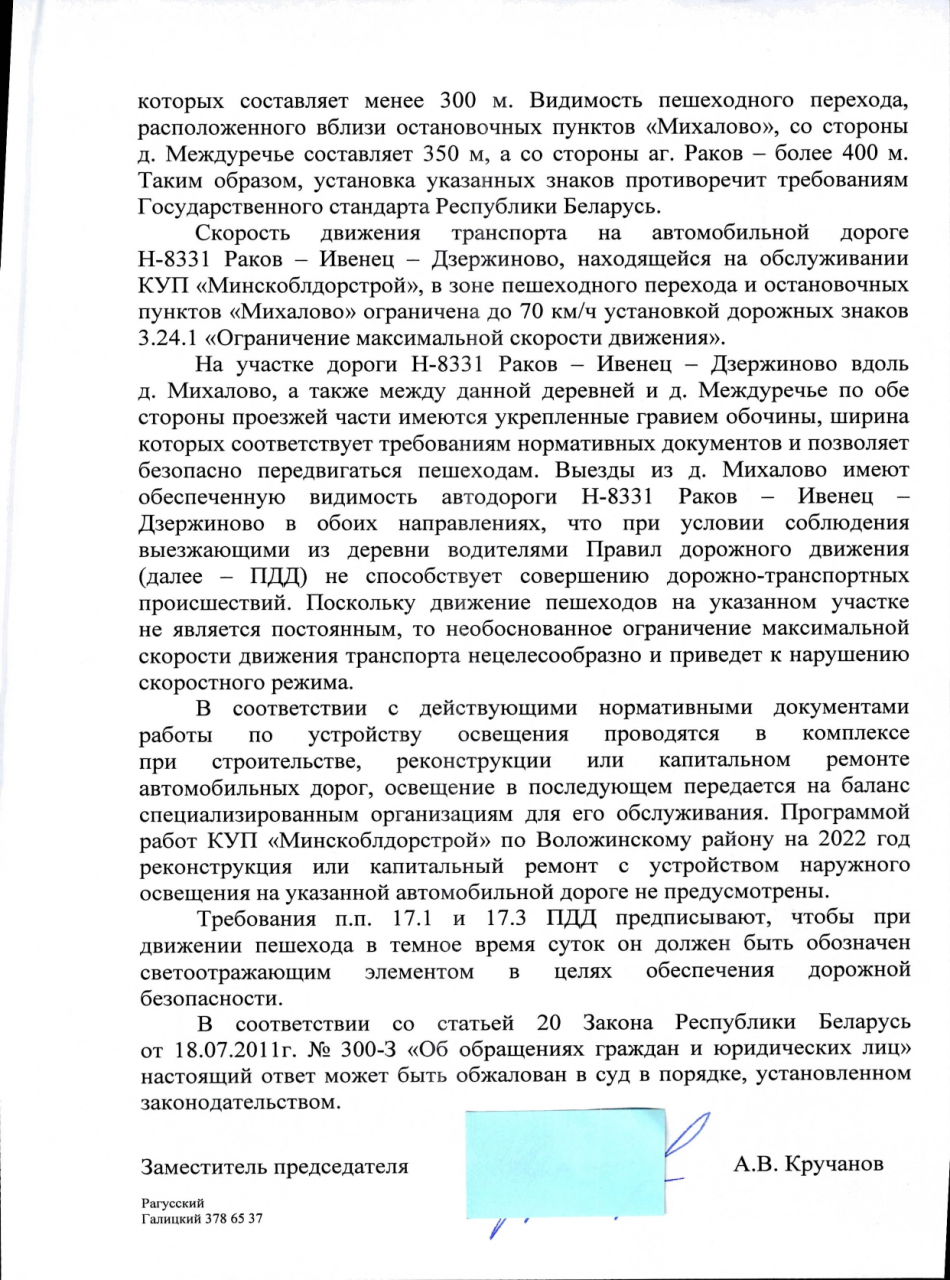 П. 2.3) В ответе не указано то, что было озвучено 10.11.2021 на встрече с заявителями: что по предписанию ГАИ дорожные знаки 5.22.1 и 5.23.1 "Михалово" в процессе изготовления и будут установлены. Также на встрече с жителями была озвучена проблема отсутствия перед пешеходные переходом к остановке "Михалово" предупреждающего дорожного знака 1.20 "Впереди пешеходный переход", а ответственными лицами жителям, в том числе было предложена установка знаков 3.24.1 ограничения скорости до 70 км/ч по трассе Н8331 на всем её протяжении вдоль д.Михалово из-за большого количества выездов из деревни на эту дорогу, а также ввиду движения пешеходов по этой трассе по пути на остановку. На данный момент, указанные дорожные знаки не установлены, проблема безопасности дорожного движения не решена и в полученном ответе не указаны пути её решения.