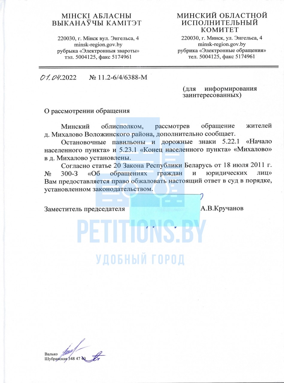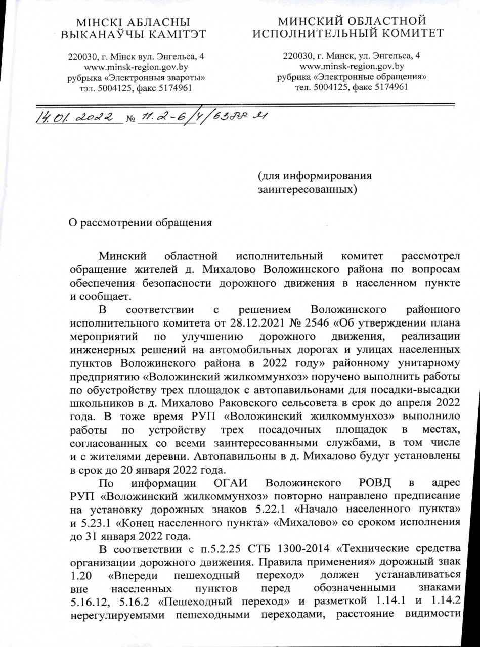 РУП "Воложинский жилкоммунхоз" поручено выполнить работы по обустройству трёх площадок с автопавильонами для посадки-высадки школьников д.Михалово до апреля 2022 г. Повторно в адрес указанного РУП направлено предписание на установку дорожных знаков 5.22.1 "Начало населённого пункта" и 5.23.1 "Конец населённого пункта" до 31.01.2022.