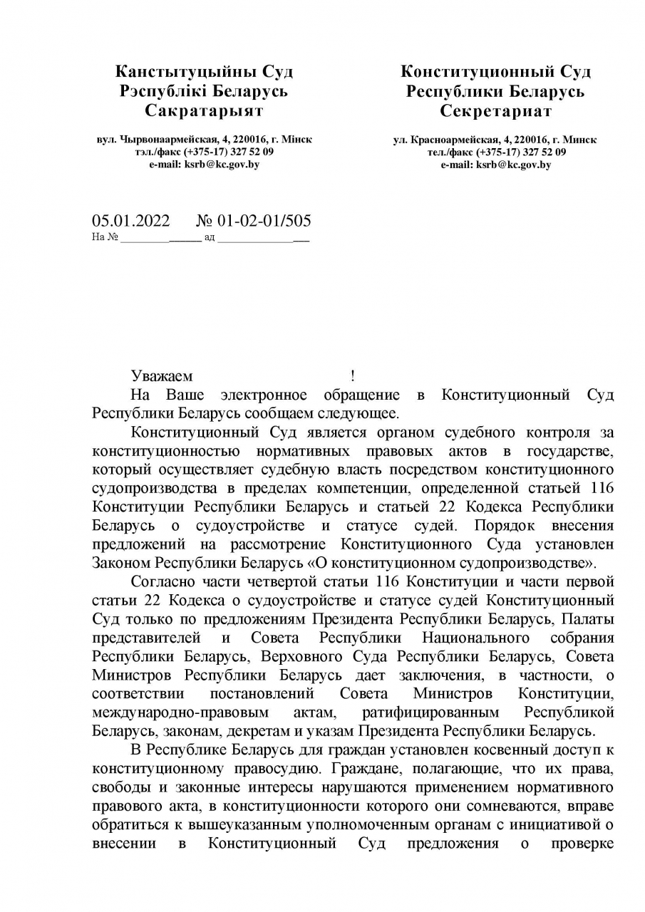 На основании вышесказанного, а также пункта 67 Регламента Конституционного Суда Республики Беларусь, утв. решением Конституционного Суда от 08.04.2014 № Р-916/2014, просим пояснить: