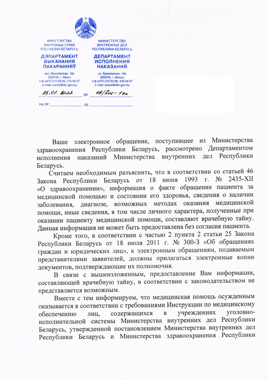 Также обращаем внимание, что пункт 6 статьи 10 Уголовно-исполнительный кодекс Республики Беларусь гарантирует осужденным право на охрану здоровья. При этом медицинская помощь может оказываться в амбулаторных, стационарных условиях, в условиях отделения дневного пребывания, а также вне организации здравоохранения в порядке, установленном законодательством Республики Беларусь.