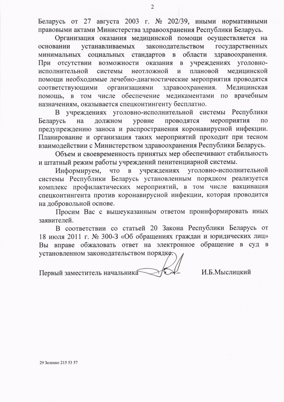 Часть 1 статьи 10 Закона Республики Беларусь от 16.06.2003 № 215-З «О порядке и условиях содержания лиц под стражей» гарантирует лицам, содержащимся под стражей, право на получение медицинской помощи. Также часть первая статьи 15 указанного выше Закона возложила обязанность по организации оказания медицинской помощи и соблюдения требований законодательства в области санитарно-эпидемиологического благополучия населения в местах содержания под стражей возлагается на руководителя администрации места содержания под стражей.