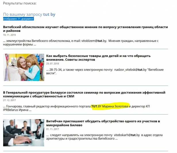 На сайте Витебского облисполкома (https://vitebsk-region.gov.by/) по поисковому запросу - https://vitebsk-region.gov.by/ru/search-ru/getResults/?search_str=tut.by&x=9&y=8 - находится не менее 71 упоминание сетевого издания (в т.ч. прямых ссылок, фотографий с водяными знаками и др.), чья информационная продукция была признана решением суда Центрального района г.Минска от 13 августа 2021 года экстремистской, и включена в Республиканский список экстремистских материалов по состоянию на 09.01.2022 (прилагается к обращению).