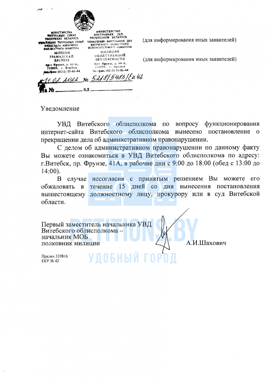 УВД Витебского облисполкома по вопросу функционирования интернет-сайта Витебского облисполкома вынесено постановление о прекращении дела об административном правонарушении