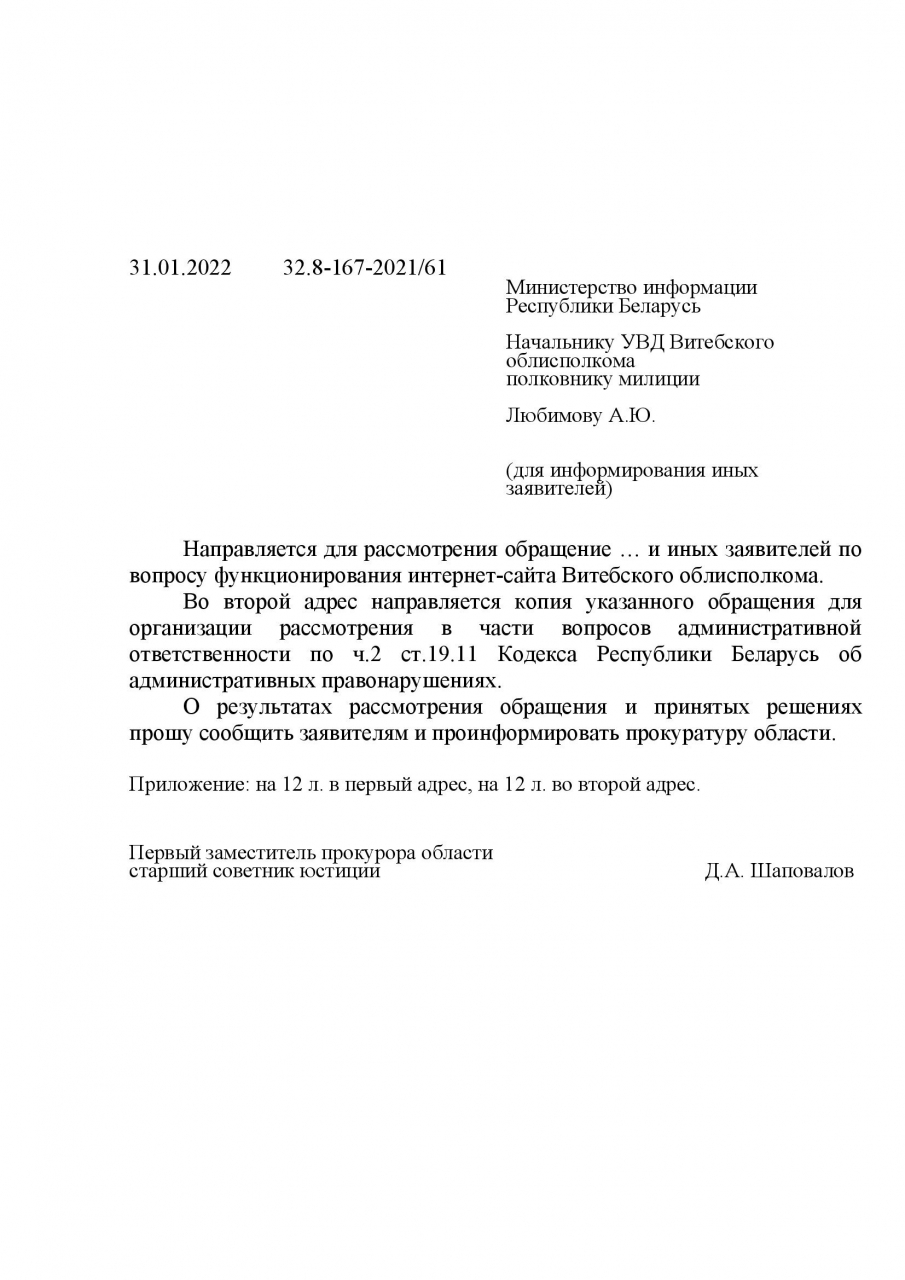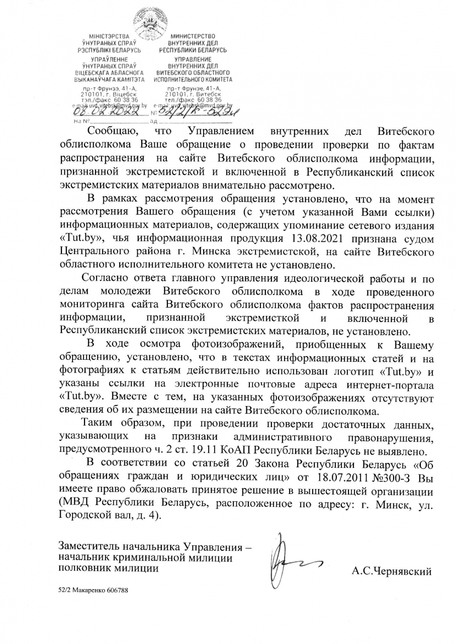 Обращение перенаправлено в Министерство информации Республики Беларусь и УВД Витебского облисполкома
