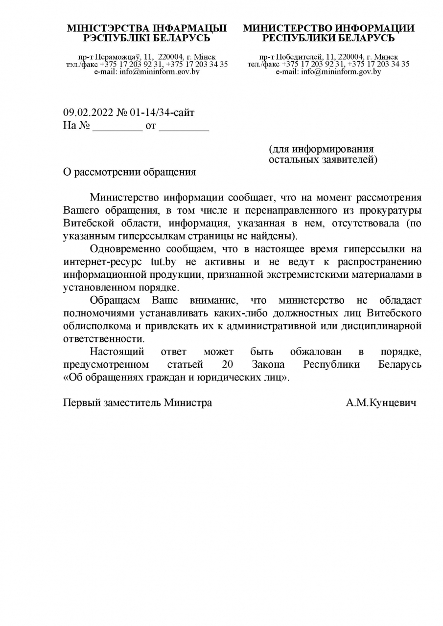 - На момент рассмотрения обращения материалов, содержащих упоминание издания «ТUT.BY», на сайте Витебского облисполкома не обнаружено.