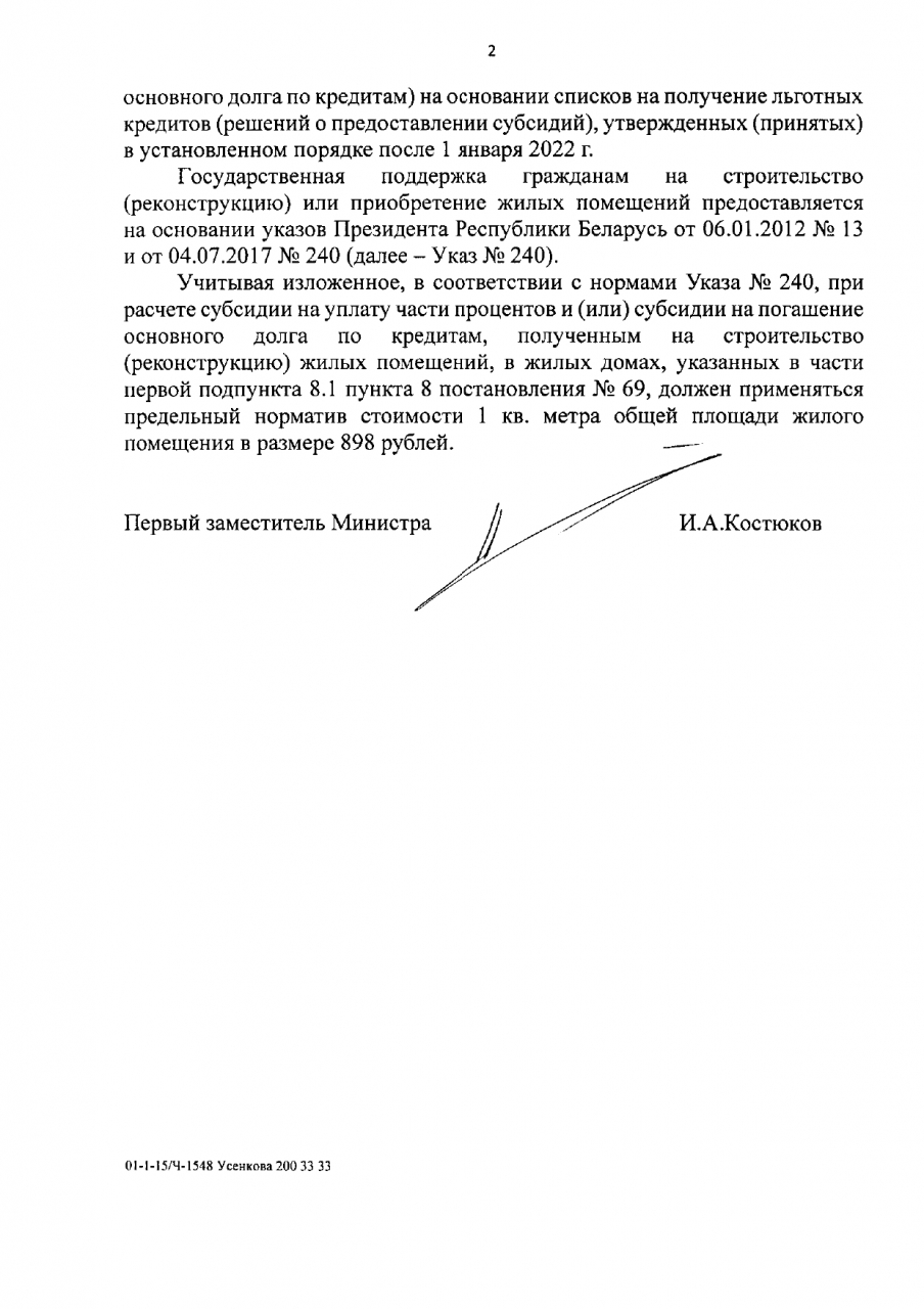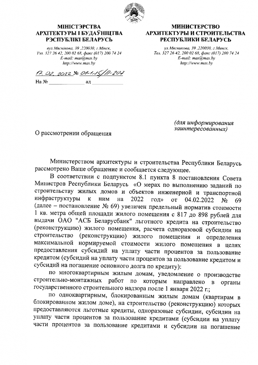 На данный момент стоимость 1 кв. м. у застройщика в городе Бресте для многодетных семей составляет сумму от 1360 р. до 1580 р., а, согласно Постановлению Совета Министров от 31.12.2019 №969 "О мерах по выполнению заданий по строительству жилых домов и объектов инженерной и транспортной инфраструктуры к ним на 2020 и 2021 годы" предельный норматив стоимости 1 кв. метра общей площади жилого помещения установлен в размере 817 рублей для выдачи ОАО "СБ "Беларусбанк" льготного кредита на строительство (реконструкцию) жилого помещения, расчета одноразовой субсидии на строительство (реконструкцию) жилого помещения и определения максимальной нормируемой стоимости жилого помещения в целях предоставления субсидий на уплату части процентов за пользование кредитом, что в два раза ниже цены застройщика.
