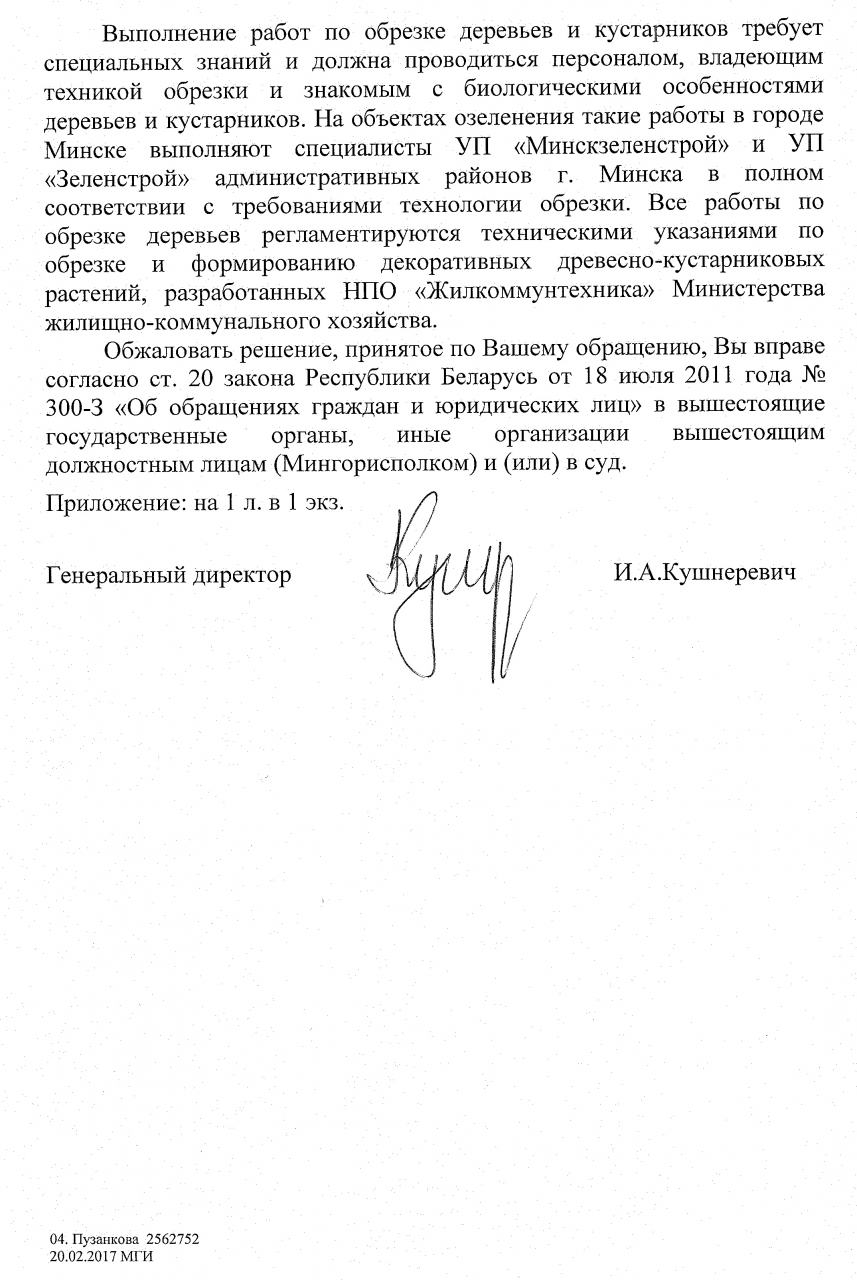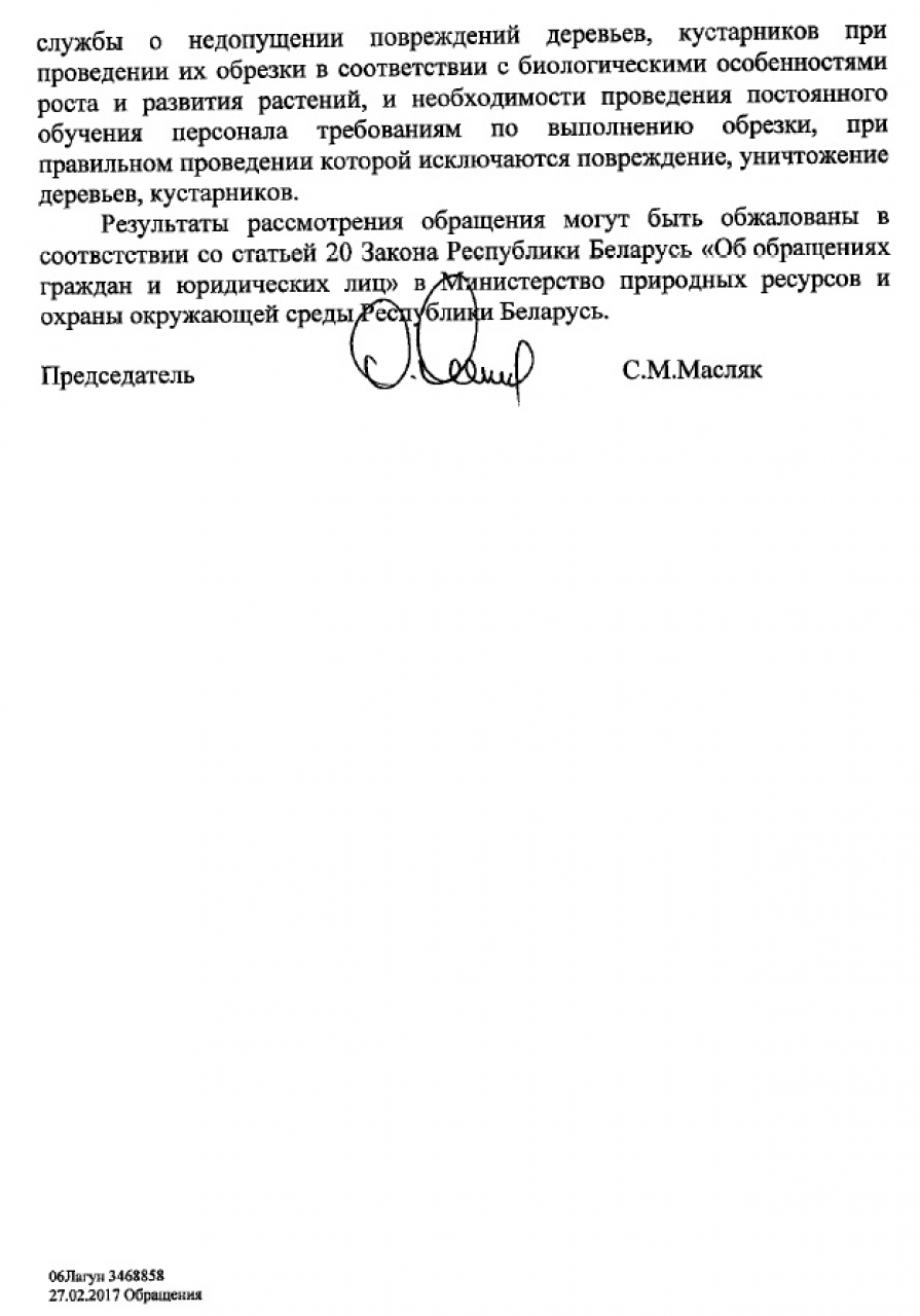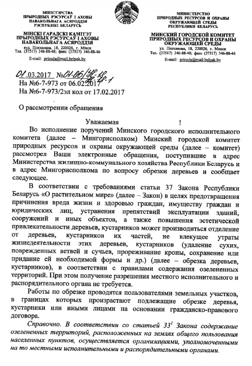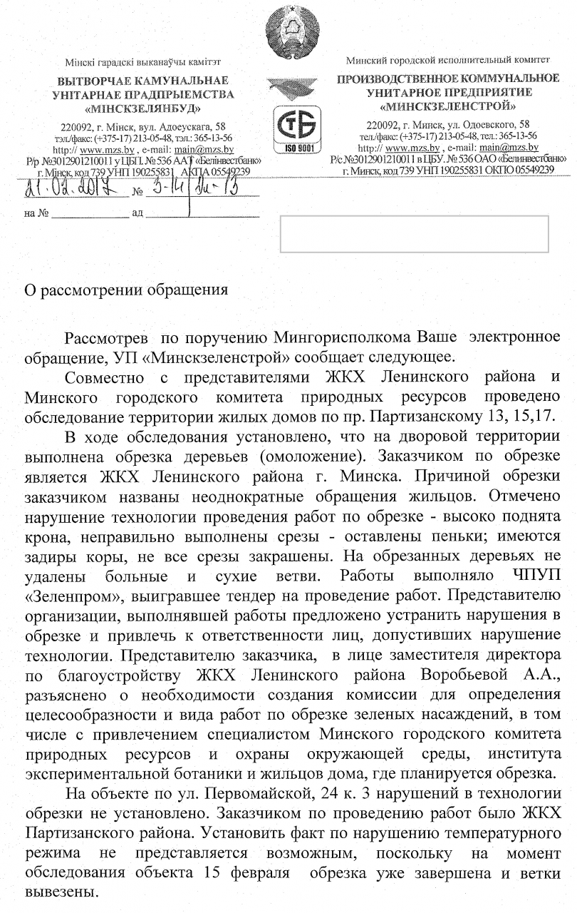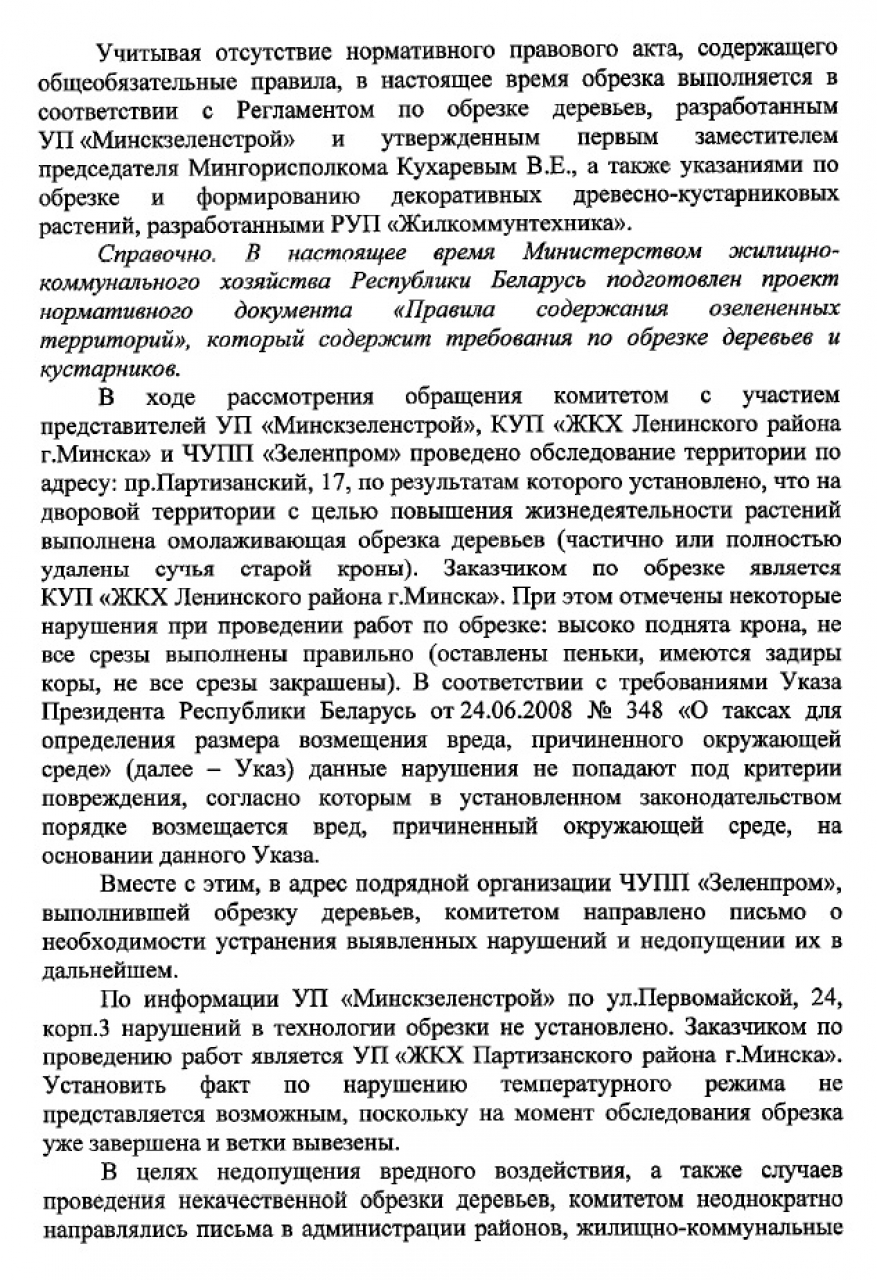 5.Соблюдать сроки обрезки зеленых насаждений. Мингорисполком не имеет права обрезать ветки при 26 градусном морозе, как это произошло в декабре 2016 года возле дома на Первомайской 24 к.3. Прогноз погоды о значительном похолодании был объявлен за 10 дней до этого, а деревья были обрезаны и стояли с незакрашеными и незащищенными срезами всю неделю морозов. Причем ветки убрали только когда морозы закончились. Если эти прекрасные ясени погибнут, домовой комитет подаст на городские власти в суд, чтобы с вас был взыскан штраф, как при умышленной рубке деревьев.