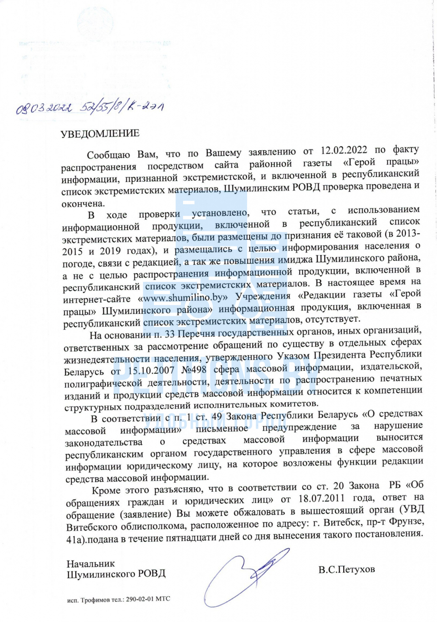 - установить должностных лиц Учреждения "Редакция газеты "Герой працы" Шумилинского района", которые осуществляли (и не препятствовали) распространению информации, признанной экстремистской и включённой в Республиканский список экстремистских материалов, и привлечь их к дисциплинарной ответственности. Просим проинформировать заявителей в ответе на настоящее обращение о принятых к указанным выше лицам мерах дисциплинарной ответственности;