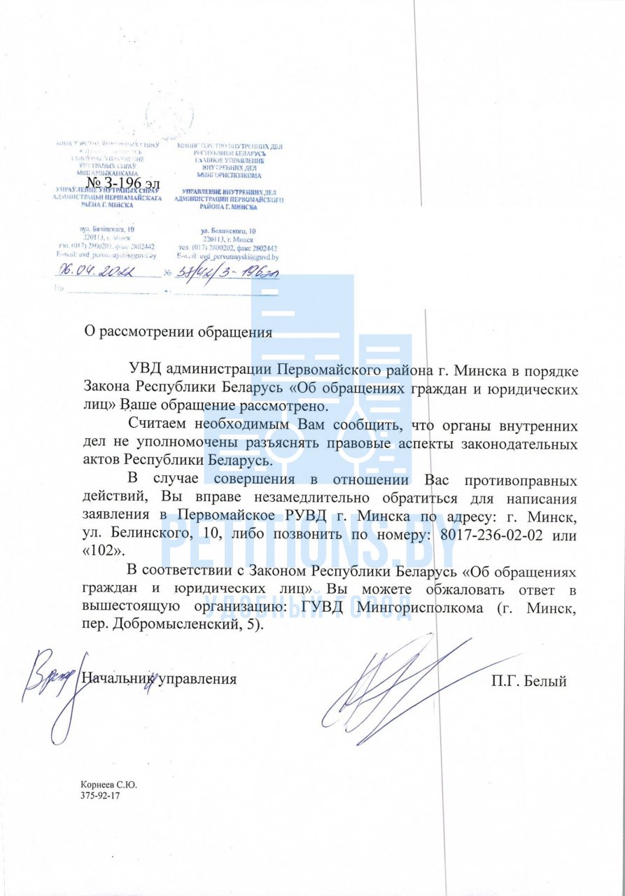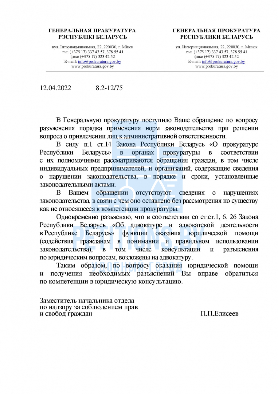 На основании вышесказанного, а также руководствуясь ст.4 и п.1 ст.14 Закона Республики Беларусь от 08.05.2007 № 220-З "О прокуратуре Республики Беларусь", просим пояснить: