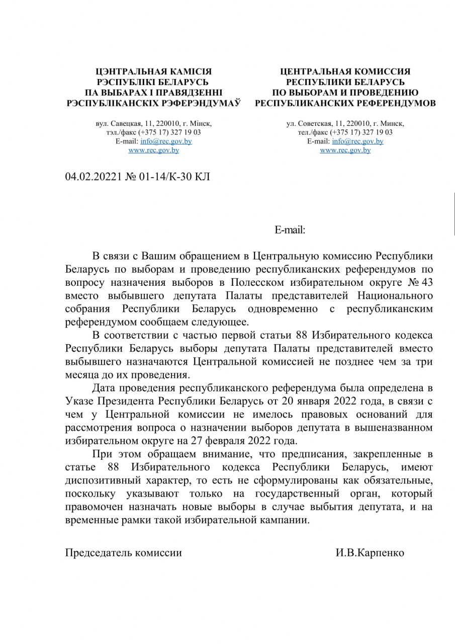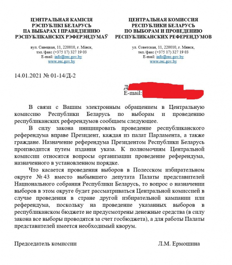 В своём ответе от 14.01.2021 №01-14/Д-2 на одно из обращений граждан Центральная комиссия Республики Беларусь по выборам и проведению республиканских референдумов (далее – ЦИК) сообщила следующее: «Что касается проведения выборов в Полесском избирательном округе №43 вместо выбывшего депутата Палаты представителей Национального собрания Республики Беларусь, то вопрос о назначении выборов в этом округе будет рассматриваться Центральной комиссией в случае проведения в стране другой избирательной кампании или референдума, поскольку на проведение указанных выборов в республиканском бюджете не предусмотрены денежные средства (в силу закона все выборы проводятся за счет госбюджета), а для работы Палаты представителей имеется необходимый кворум».