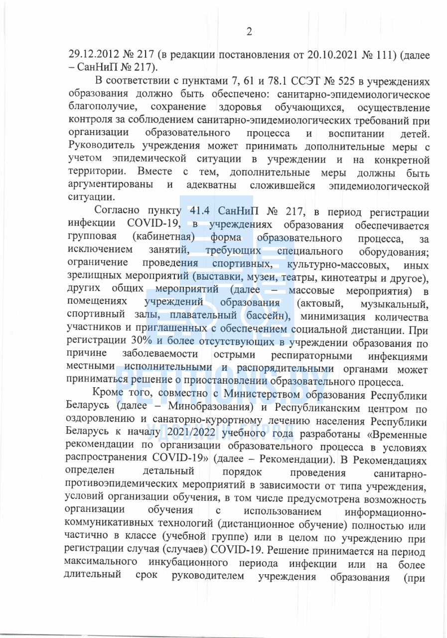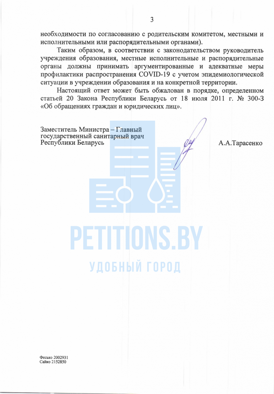 Таким образом, учитывая текущую эпидемиологическую обстановку в стране, руководствуясь ст.28 Закона «О санитарно-эпидемиологическом благополучии населения», которая обязывает нас, граждан Республики Беларусь, заботиться о состоянии своего здоровья и здоровья своих детей, требуем принять меры по организации дистанционного обучения в учреждениях общего среднего, средне-специального и высшего образования.