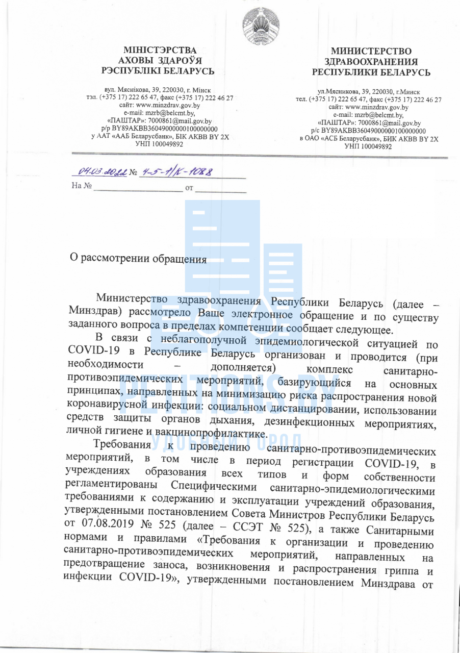 Обращаем внимание, что согласно пп 4.35 п.4 Положения о Министерстве образования Минобразования в соответствии с возложенными на него задачами осуществляет контроль за созданием здоровых и безопасных условий труда в организациях системы образования. В соответствии с пп.4.3. п.4 Положения о Министерстве здравоохранения Республики Беларусь одной из основных задач Минздрава является, в том числе, организация обеспечения санитарно-эпидемического благополучия населения Республики Беларусь.