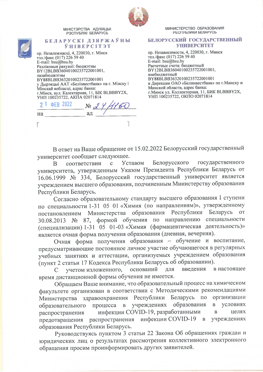 В связи с рекордным числом заболеваний коронавирусом в Беларуси, руководствуясь ст.41 Кодекса об образовании, которая обязывает учреждения образования обеспечивать охрану здоровья обучающихся в соответствии с законодательством, а также п.27 и п.38 Устава Белорусского государственного университета, которые гарантируют право на безопасные условия труда и учёбы в БГУ, требуем ввести дистанционную форму обучения на химическом факультете БГУ.