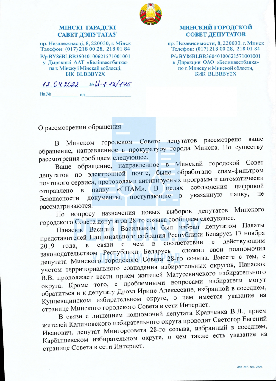 На основании всего вышеизложенного, требуем в ближайшее время назначить выборы депутатов Мингорсовета вместо выбывших депутатов по Матусевичскому избирательному округу №33 и по Калиновскому избирательному округу №49 в – соответствии с требованиями законодательства.