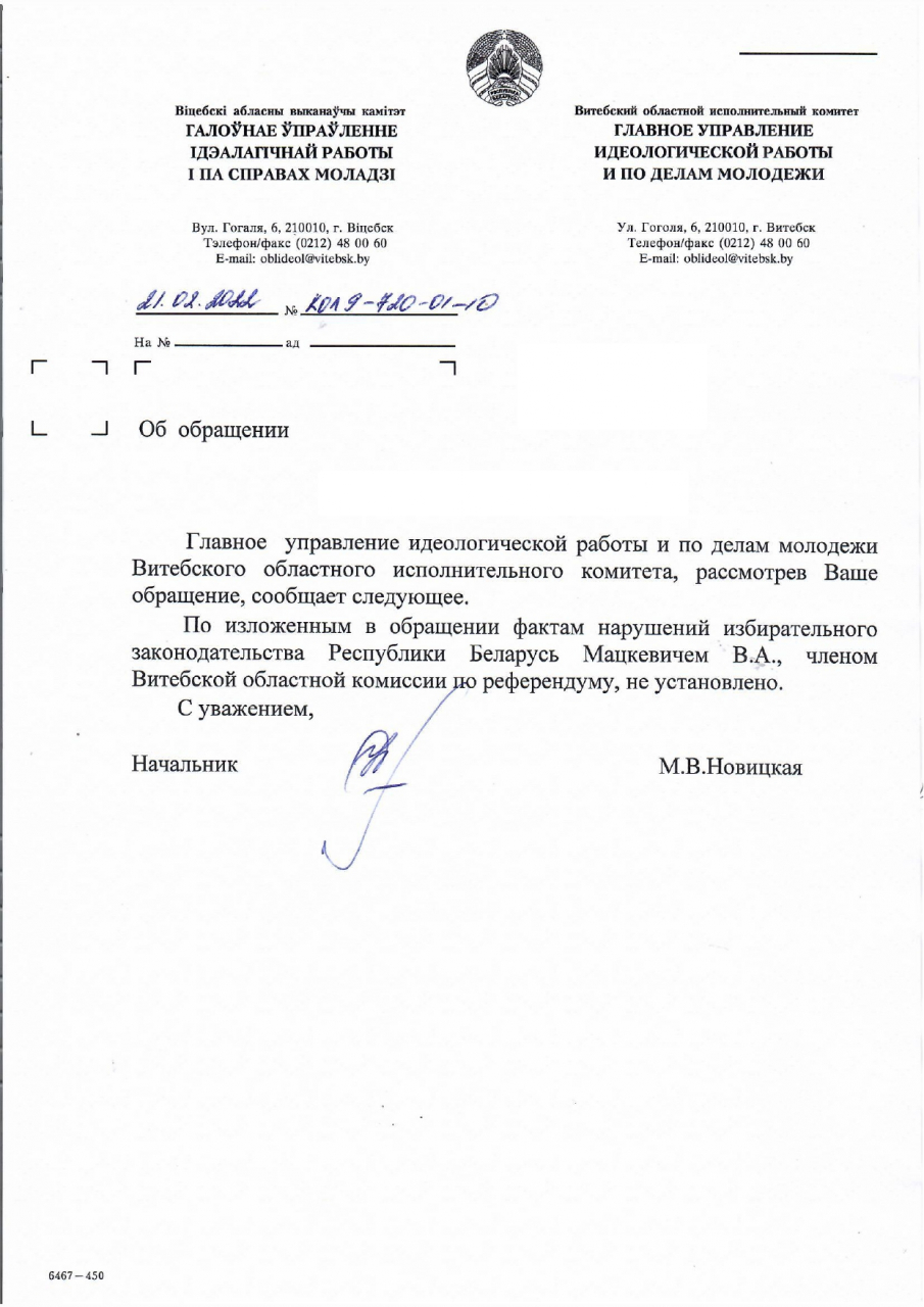 По изложенным в обращении фактам нарушений избирательного законодательства членом Витебской областной комиссии по референдуму Мацкевичем В.А. не установлено.