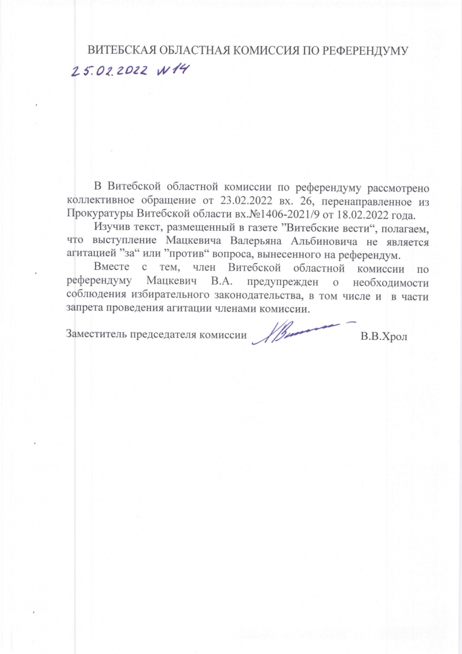 Выступление Мацкевича В.А., опубликованное в газете "Витебские вести", не является агитацией "за" или "против" вопроса, вынесенного на референдум. Мацкевич В.А. предупреждён о необходимости соблюдения избирательного законодательства.