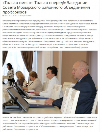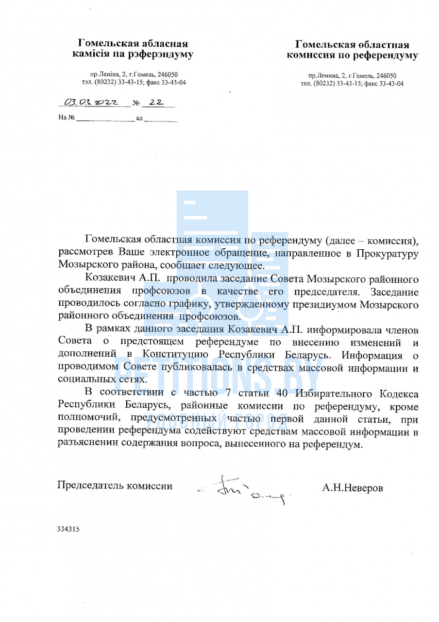 Председатель Мозырского районного объединения профсоюзов, депутат Мозырского районного Совета депутатов 28 созыва Козакевич Анна Павловна – член районной наблюдательной комиссии по референдуму, состав которой был утвержден решением от 24 января 2022 года (http://mozyrisp.gov.by/ru/referendum).