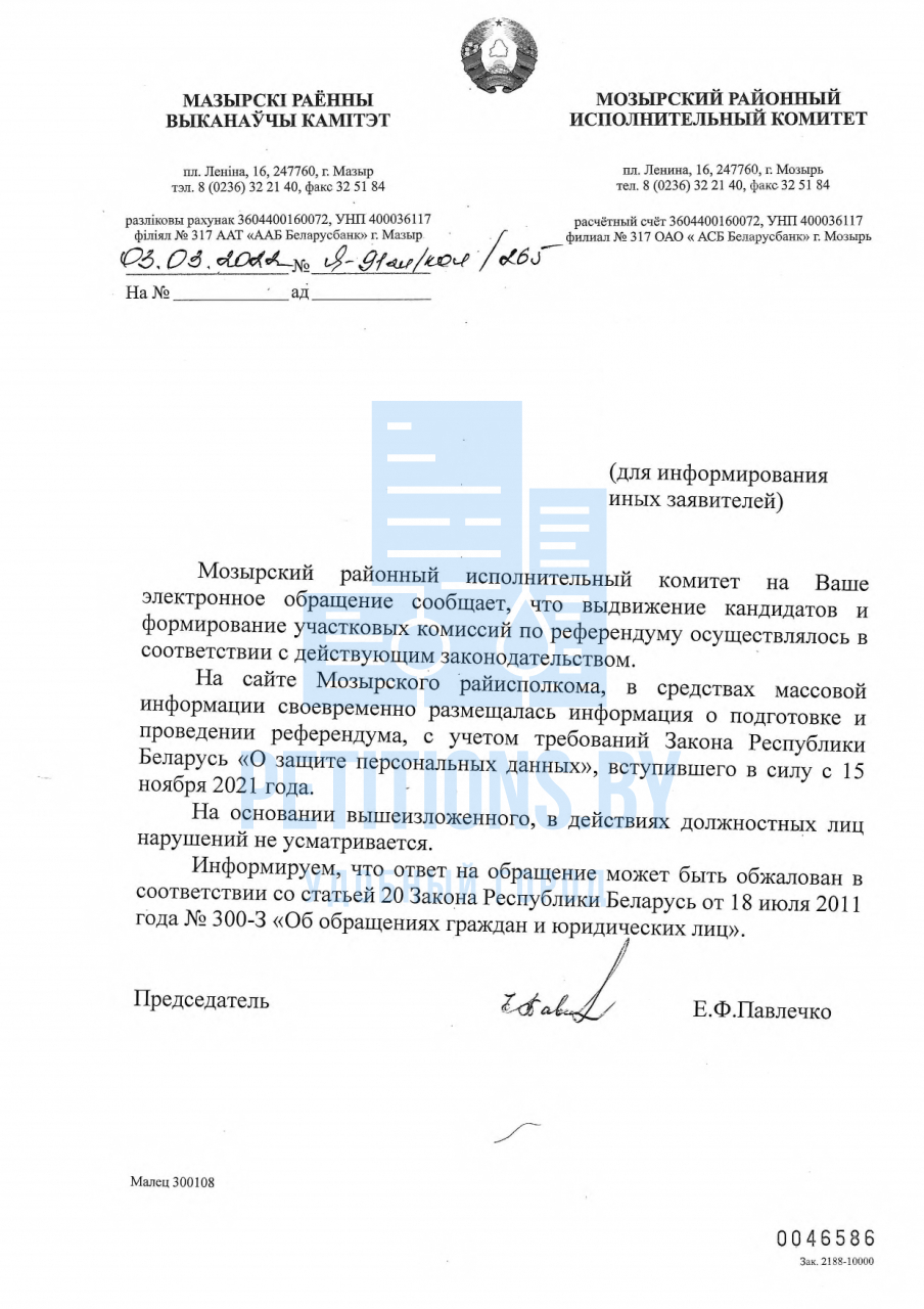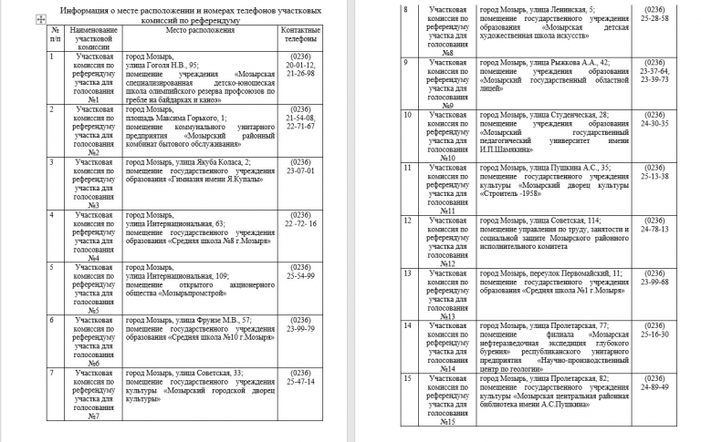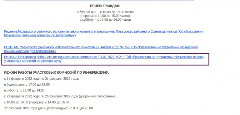По информации, размещённой на сайте Мозырского райисполкома, 4 февраля 2022 года принято решение №214 "Об образовании на территории Мозырского района участковых комиссий по референдуму". В указанном документе содержится информация только о месте расположения и номерах телефонов участковых комиссий по референдуму.