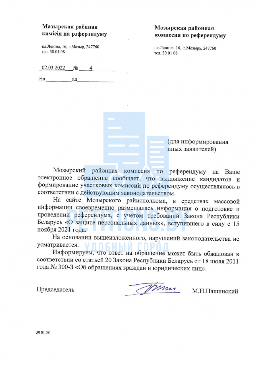 - провести проверку по признакам наличия в действиях должностных лиц Мозырского райисполкома и (или) иных лиц, ответственных за опубликование на сайте решения от 04.02.2022 №214, несоблюдения требований ст.34 Избирательного кодекса Республики Беларусь;