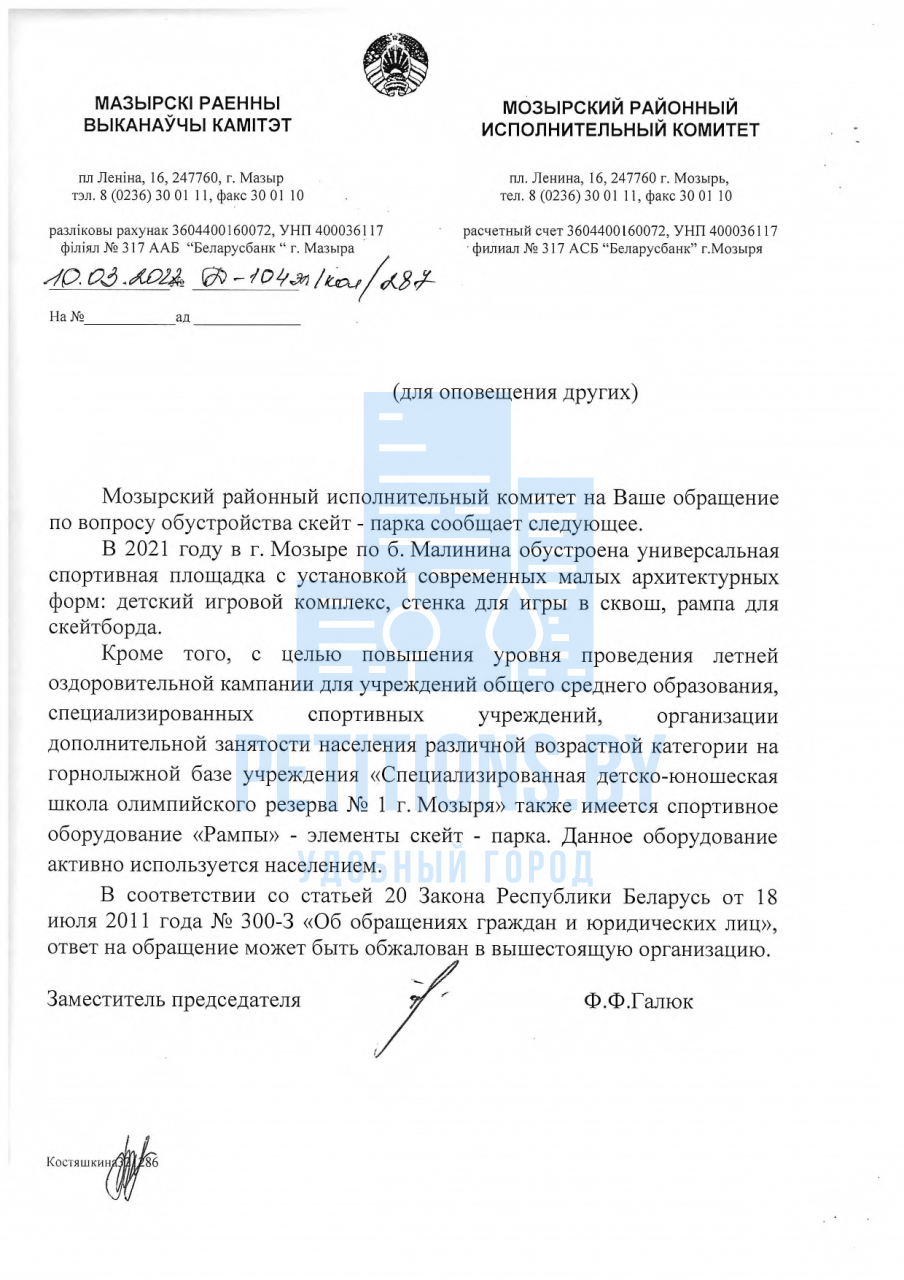 Настоящим обращением хотим привлечь Ваше внимание к проблеме отсутствия в Мозыре каких-либо площадок для таких видов спорта как скейтбординг, BMX, которые ныне очень популярны среди молодёжи, к которой мы, заявители, себя относим.